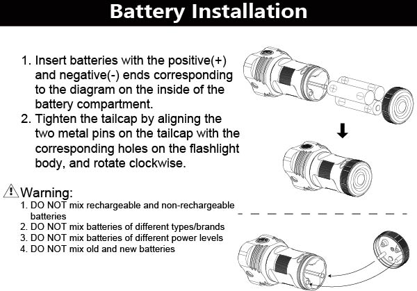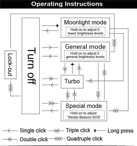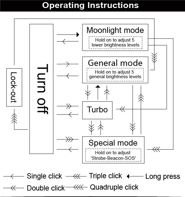General mode: While OFF, single click switch to enter general mode. Press and hold on switch to adjust 5 general brightness levels (cycle through 'Low >Mid1 > Mid2 > High' or 'High > Mid2 > Mid1 > Low'). Release switch to select one level you want. Press and hold on switch again to cycle levels through opposite direction. While cycle to last level 'high' (or 'low'), the light will stay this level and stop cycle. After entering in general mode, single click switch to turn it off; double click to Turbo; triple click to special mode.
