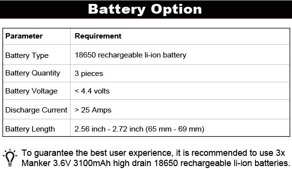 - Powered By 3x 18650 rechargeable li-ion batteries 3100mAh (Included)