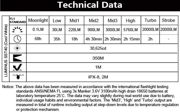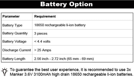 - Accessory: Quality holster *1, Lanyard *1, Waterproof o-ring *1, User manual *1, 3/8" to 1/4" Tripod Thread Adapter, 3 18650 Manker 3100 mAh rechargeable batteries