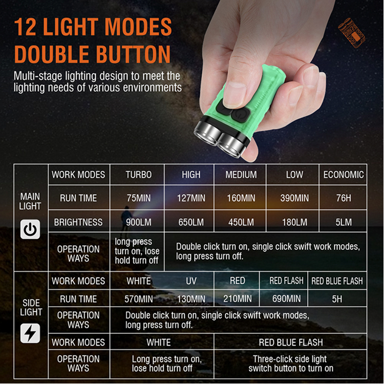 Main light: very bright (long press the main light switch button to open the release of off) 900LM- Double click the main light switch button to open.
