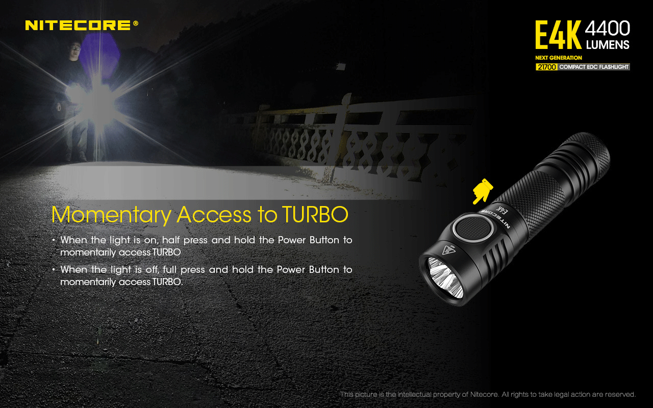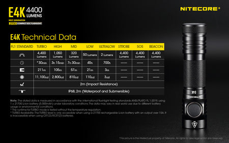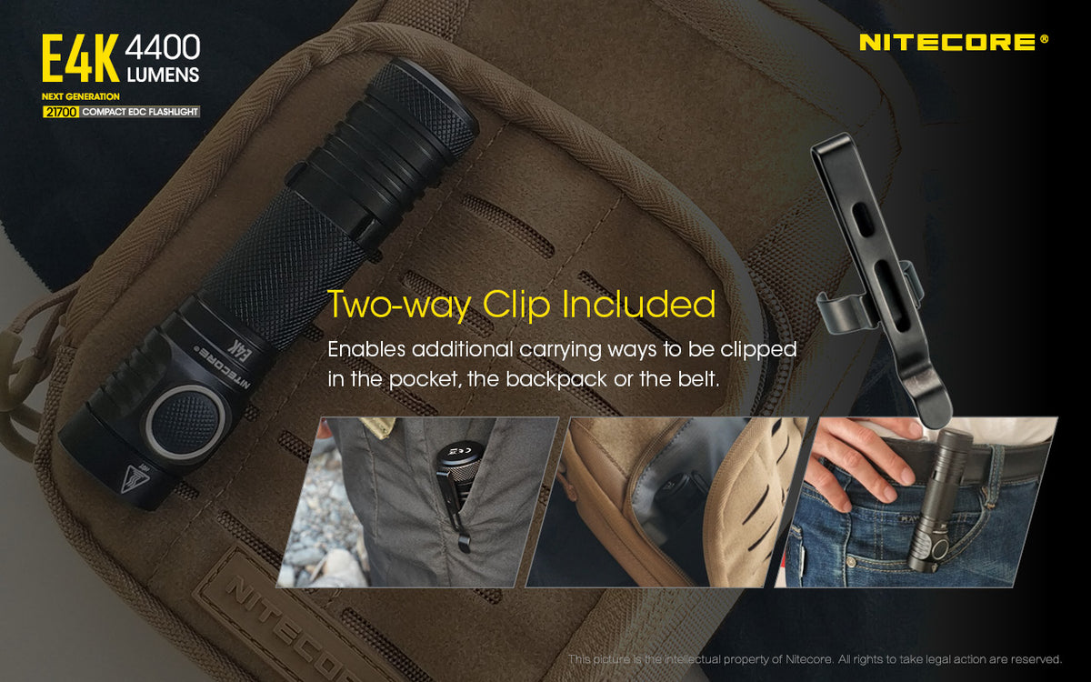 The Nitecore E4K is the most powerful EDC flashlight you ever had. Weighing in at only 2.82 ounces and measuring less than 5 inches in length, the E4K radiates 4400 lumens for up to 230 yards. The light’s compact ultra lightweight design allows for a comfortable grip in hand. Use the included two-way clip to add the light to any belt, vest, or pocket. With an IP68 waterproof rating, 1 meter impact resistant rating, and Advanced Temperature Regulation (ATR) technology, the NITECORE E4K is set to become anyone’s best safety companion for outdoor activities.