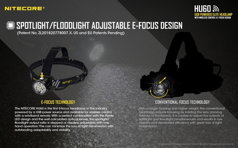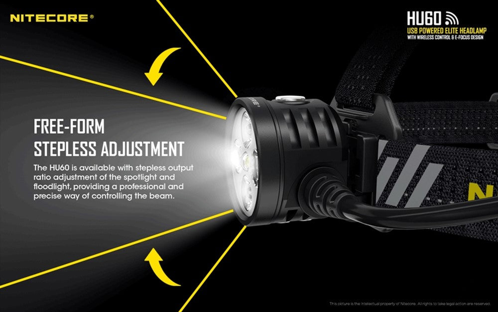 The NITECORE HU60 is a focusable headlamp with a maximum brightness of 1600 lumen designed for outdoor activities like trekking, caving, climbing. Fully focus the HU60 to 100% spotlight and you get a powerful beam that reaches 177 yards, ideal for exploration and search and rescue. Fully adjust the HU60 to floodlight and you get 170 degrees of illumination that covers nearly everything in front of you, great for biking or running at night. This revolutionary headlamp brings the power, flexibility, and reliability to everyone.