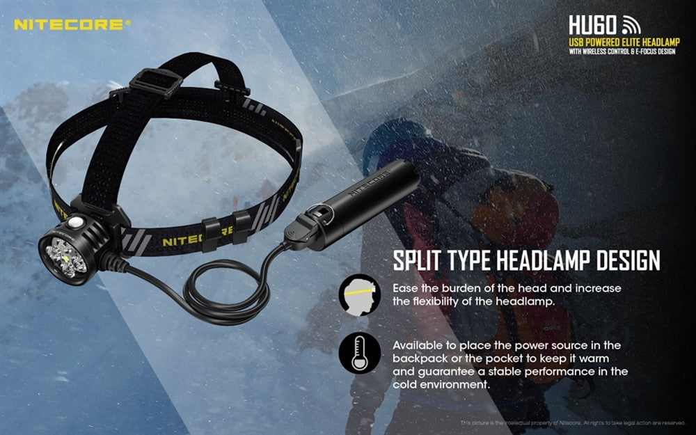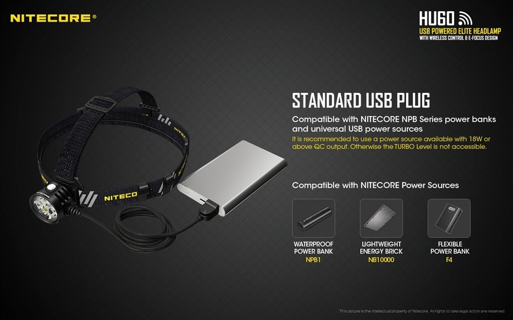 The HU60 can be powered by any external USB power source with at least a 2A output. This reduces the weight of the headlamp, significantly lowering fatigue during use. It also means that as long as you have a compatible power source, the HU60 can continue to function. Nitecore NPB series waterproof power banks have a built in lock to attach to the HU60's USB cable, guaranteeing a secure connection. Enjoy up to 10 hours on high when paired with Nitecore NPB2 power bank or any other power bank with at least 5000 mah.