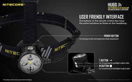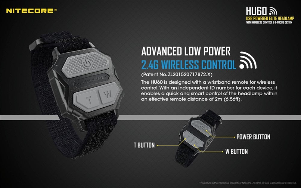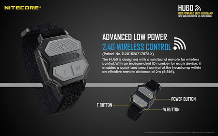 Operating the HU60 is super easy with a simple three button design. One button turns the headlamp on and off. The other two buttons to change the focus of the flood and spot.; it's that simple! It comes with a three button wireless wristband remote that provides quick, easy access to all of the HU60's functions, especially useful in a tight spot.