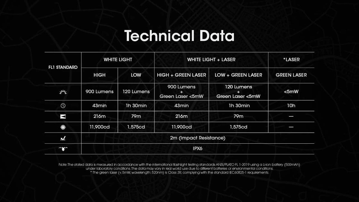 | High | 900 lumens + Green Laser < 5mW | 43 mins |