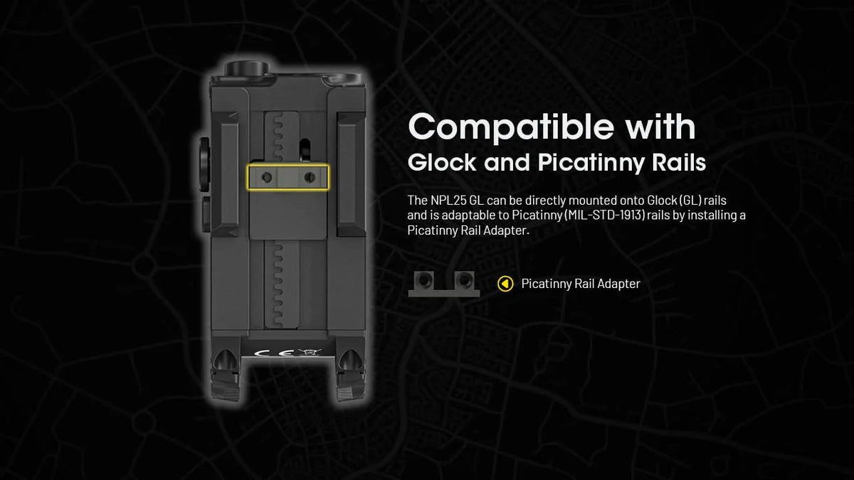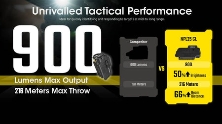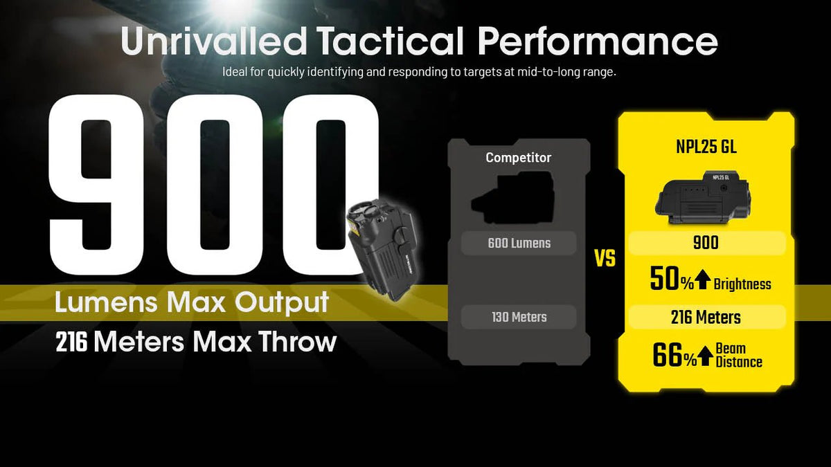 The Nitecore NPL25 GL takes everything you love about the NPL25 like its powerful illumination and reliability and now includes an integrated green laser for enhanced precision. Ideal for tactical or range applications, the new green laser adds essential accuracy and versatility to your lighting tool. With a maximum output of 900 lumens and a throw of 236 yards, the NPL25 GL is compatible with most compact and full-size pistols, making it adaptable for various setups.