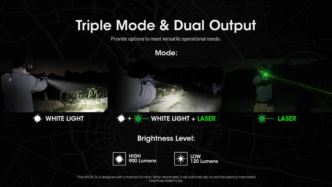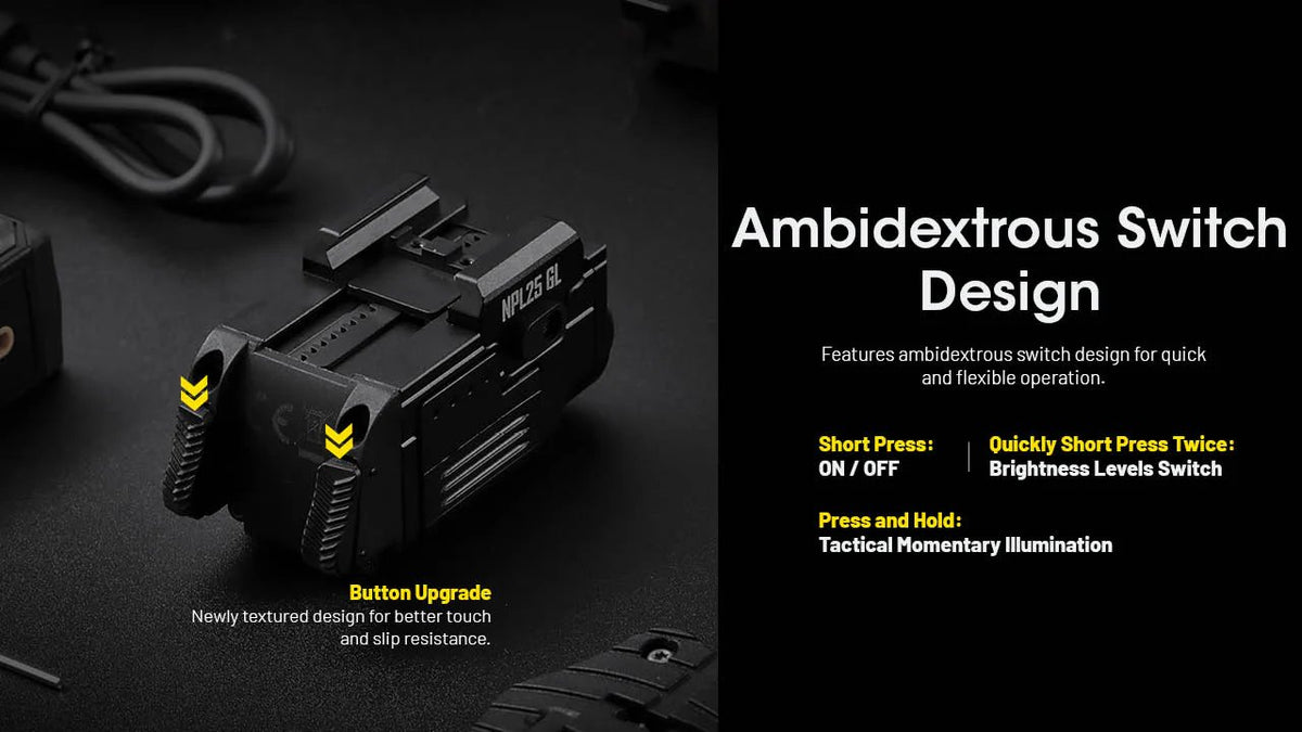The NPL25 GL’s ambidextrous switch design supports both left- and right-handed users, and it offers three modes: White Light, Green Laser, and a combination of the two. Short-press either switch for continuous lighting, or press and hold for momentary illumination. To change brightness levels, double-click either power button, and to switch between modes, hold one switch while short-pressing the other.
