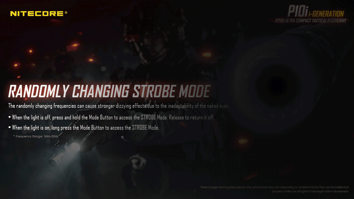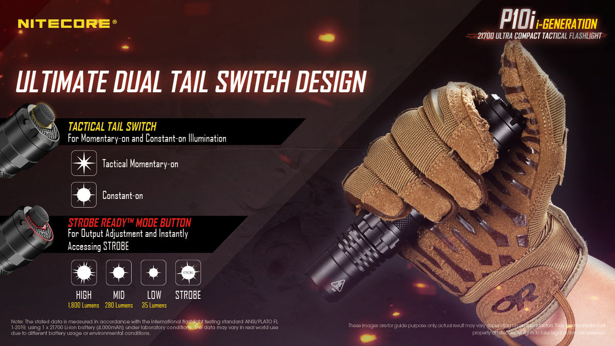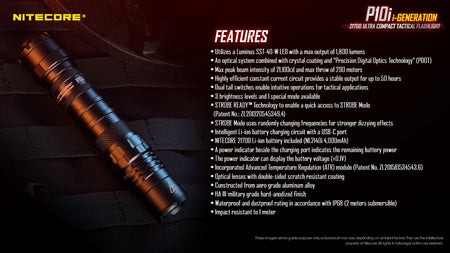 The NITECORE P10i is the ultimate high performance tactical flashlight, emitting up to 1800 lumens with a max throw of 317 yards. Designed for law enforcement and military situations, this torch comes equipped with a non linear strobe and an ultra strong strike bezel. Non-linear strobe patterns cause enhanced dizzying effects, highly effective for diffusing a tense situation.