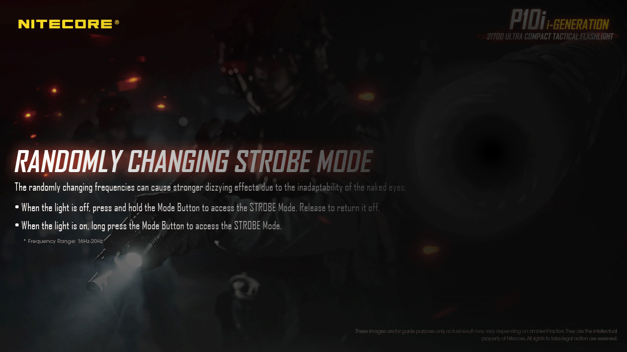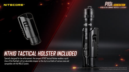 With strobe ready technology, just press and hold the inlaid mode button to enable the strobe mode at any time. Cycle through the 3 brightness levels by short pressing the mode button. The included NTH10 tactical holster and is compatible with standard police duty belt and MOLLE systems, making it an ideal choice for security, police, or military personnel. Surprises on duty can be dangerous, be ready for anything with the P10i!