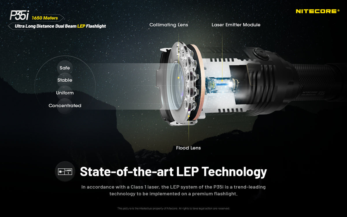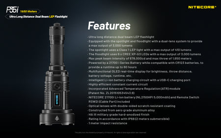 The P35i Ultra Long Distance Dual Beam LEP Flashlight is a newly designed member of the Precise Series. Utilizing 6 x CREE XP-G3 LEDs and a Class 1 LEP light, it has a max output of 3,000 lumens and a max throw of 1,650 meters.