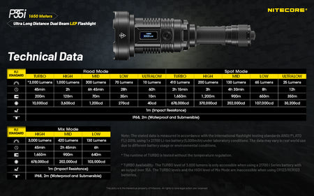 Floodlight check, spotlight check, ultra low mode check, mixed mode turbo check. Every possible lighting requirement is covered by the P35i. Additionally, the P35i is made from durable aero grade aluminum alloy and is rated IP68 waterproof. The ultimate floodlight, spotlight, or any light. The P35i can literally light up further than any flashlight you could possibly find.
