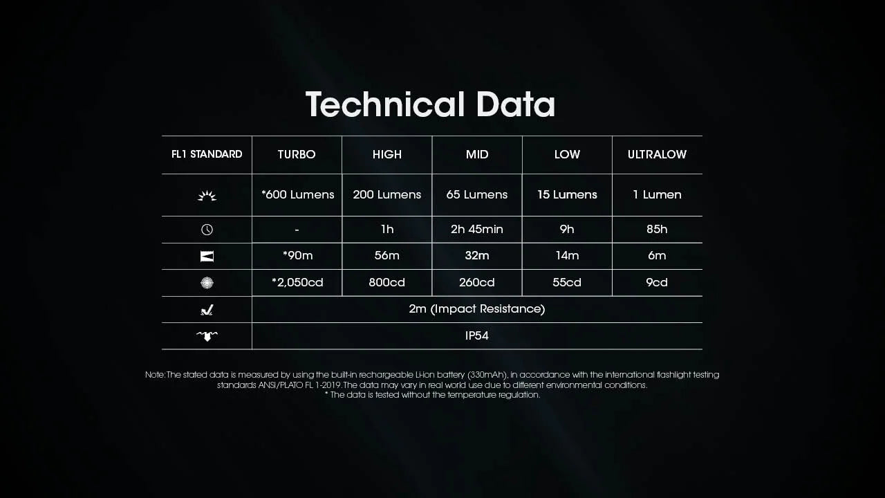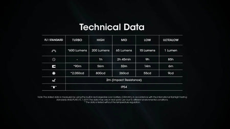 | Mid | 65 lumens | 2 hrs 45 mins |