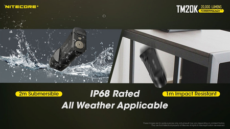The TM20K has a rechargeable 9600mAh Li-ion battery built-in. The TM20K is USB-C rechargeable, and comes with a charging cable included. It is even capable of quick charge (QC) technology to speed up the charging process. When the light is connected to a QC power source, the battery status indicator will blink rapidly and the light will be fully charged in 4.5 hours. Finally, the TM20K comes standard with all of the advanced features you expect on NITECORE flashlights such as IP68 rated waterproof, advanced thermal regulation, mode memory, and lockout mode.