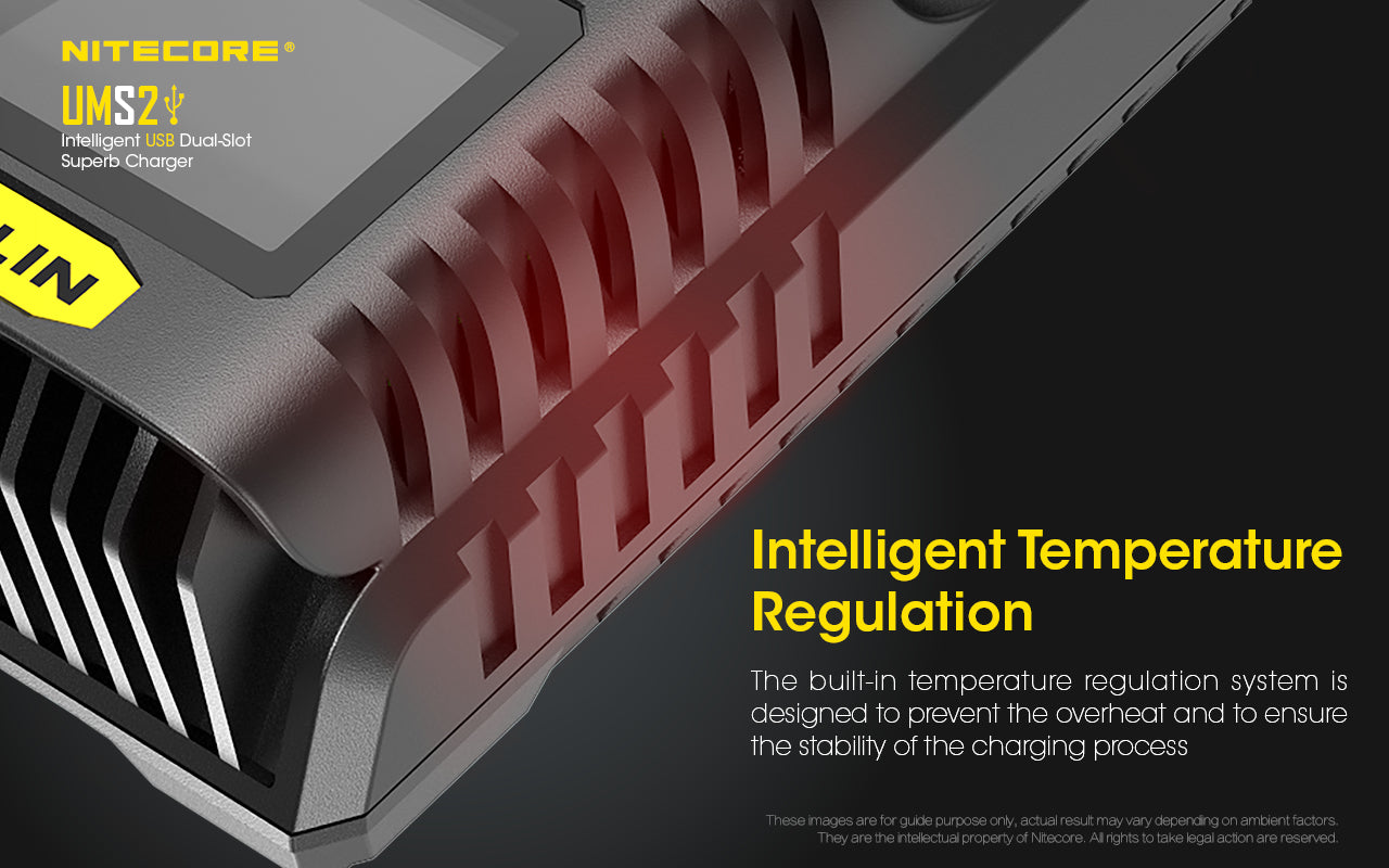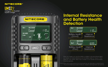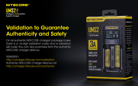 The NITECORE UMS2 Intelligent USB dual-slot charger designed to recharge your batteries fast, safe and efficiently. The UMS2 will reach a maximum total output of 4000mA when using a 2A output USB power adapter. When the charger is powered or connected to quick charge (QC) power adapter, the screen will show “Quick Charge” and the single slot will achieve a max output of 3000mA.