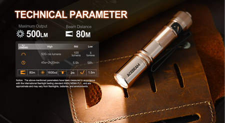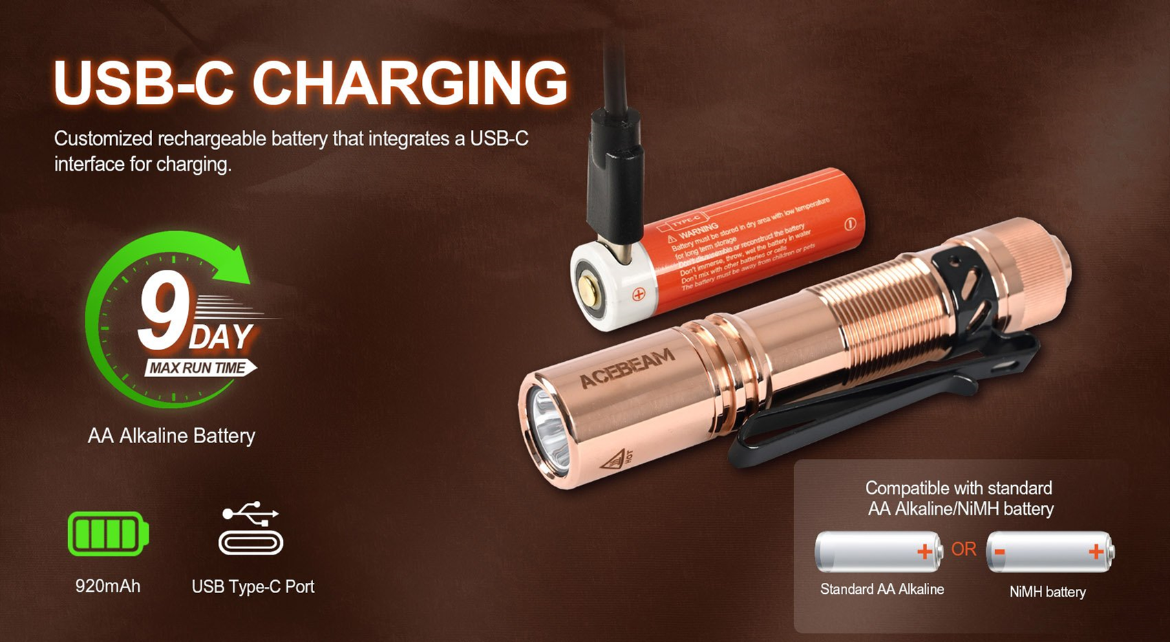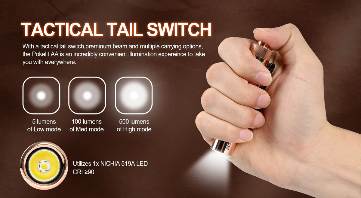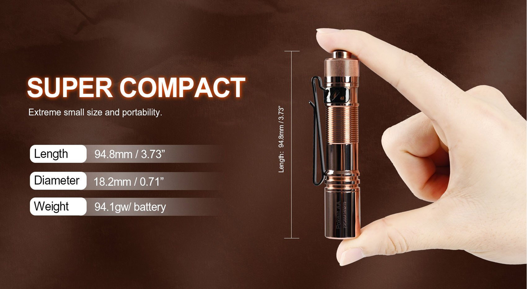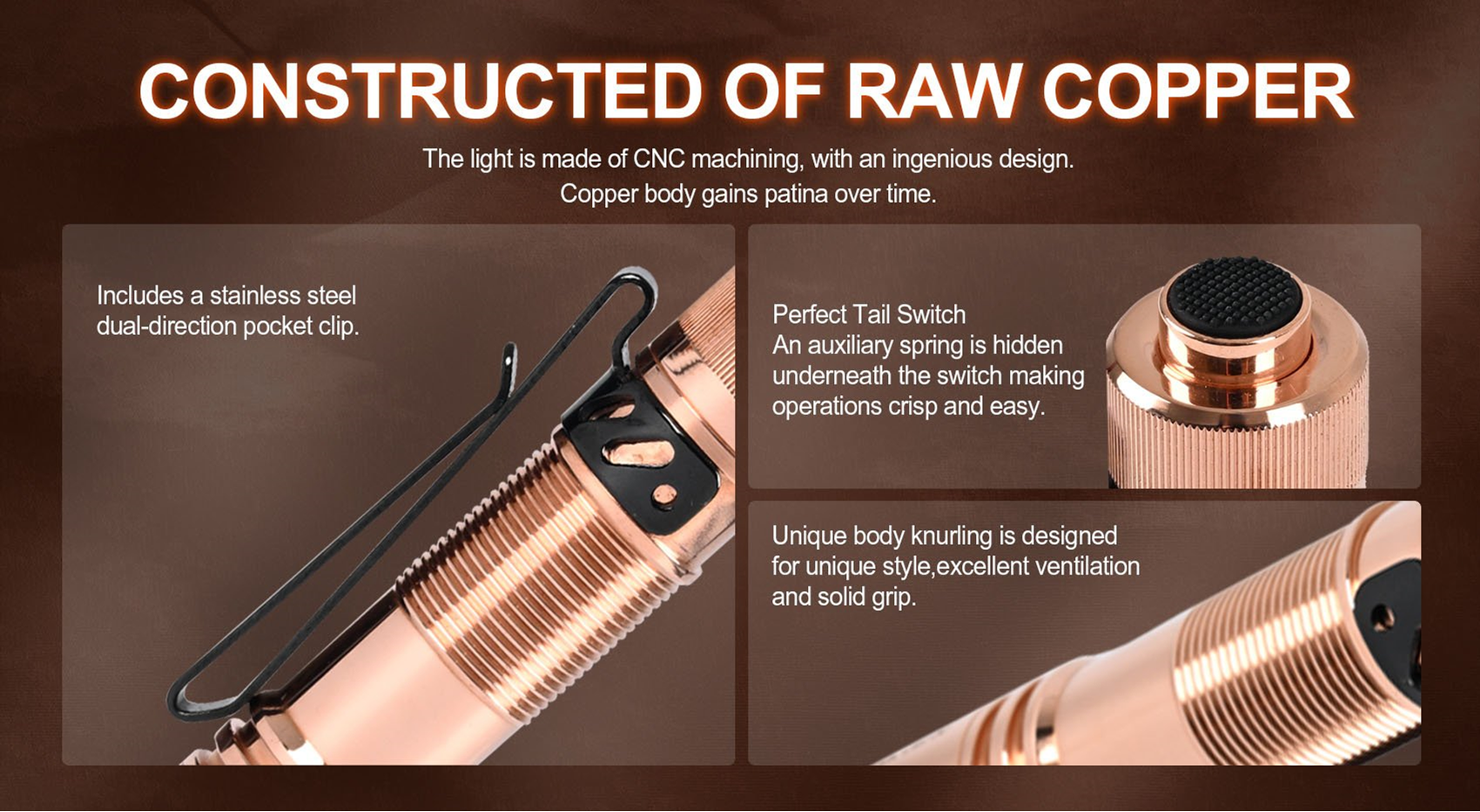The Acebeam Pokelit AA is one favorite AA-sized light on the market, the Pokelit AA copper with the pinkish-red hue of copper will certainly make your gear stand out, and as it ages it will develop a beautiful patina that adds a touch of class to your ensemble. It features a neutral high CRI90 Nichia 519A emitter with a very clear and clean round hotspot. Also, this light can run on 14500 lithium-ion batteries or AA alkaline/NiMH batteries.