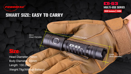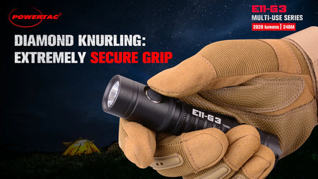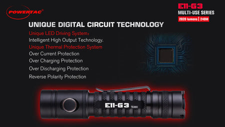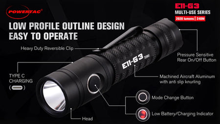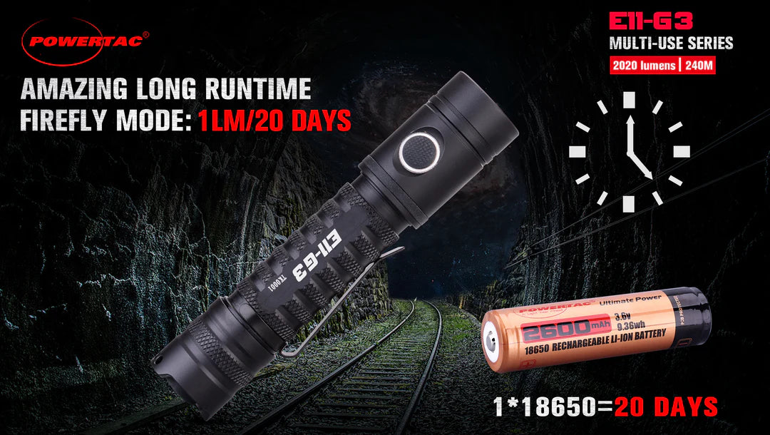 The Powertac E11-G3 is the perfect everyday carry flashlight. With a 2020 max lumen output, handy dual switch interface, and a compact and durable design, this light is the best option for both everyday tasks, professional-grade work, or improving visibility for your next outdoor adventure. This flashlight is ideal for walking down low-lit streets at night or for close-up illumination for activities like reading or completing duties around the house. The E11-G3’s dual switch interface is simple to use and gives instant activation and access to your preferred modes. Feel free to use the tail switch to activate the light and use the side switch for selecting the mode you need. Additionally, the E11-G3’s side switch doubles as an LED monitor for when you're charging the flashlights' 18650 battery pack.