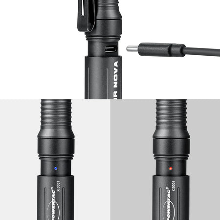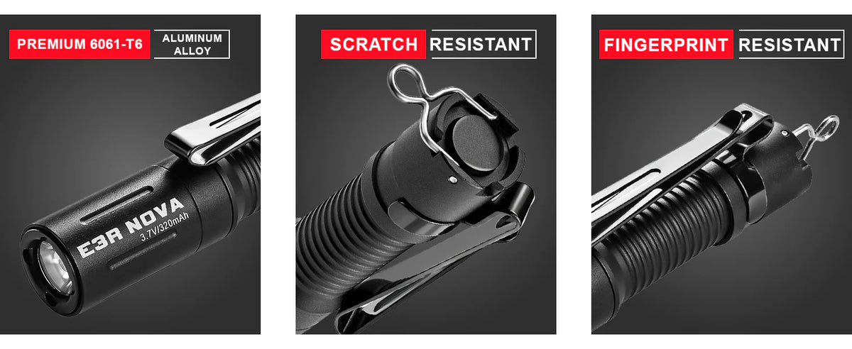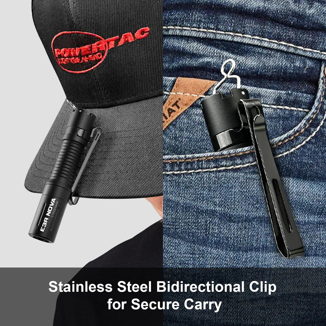 Built for enthusiasts, security professionals, and outdoorsmen alike, the Powertac E3R Nova is extremely easy to operate with all features accessible via a dedicated tail switch Even with a sub-compact frame measuring in just under 3.25", the E3R Nova is has all the design features one would expect from a Powertac light. The E3R Nova is machined from aero-grade aluminum alloy with a military grade hard-anodized finish, making it very lightweight, durable, and able to withstand any weather conditions. Being IPX-8 rated waterproof, the E3R Nova is the best sub-compact option for both EDC and tactical utility, and it comes with a removable bidirectional clip for hands-free transport and a handy attachment ring to clip on to anything.