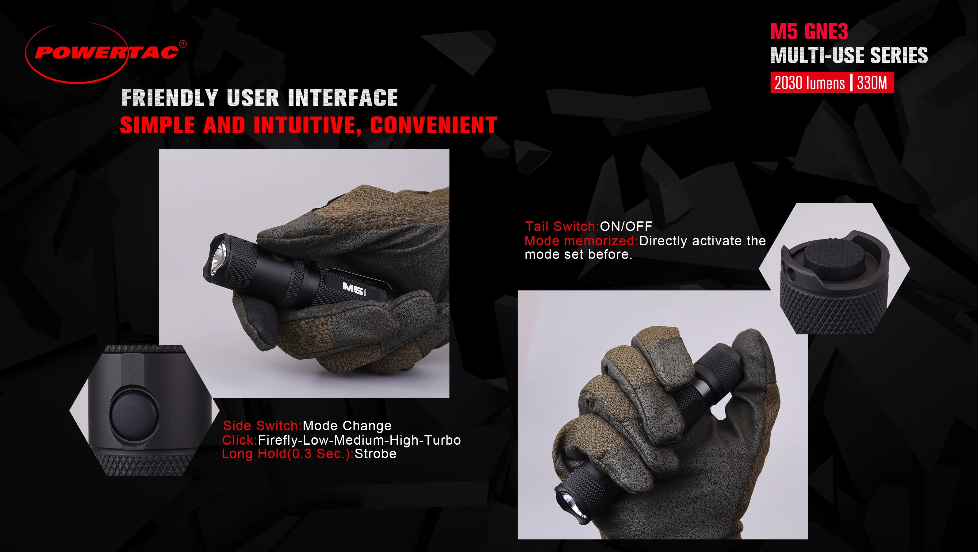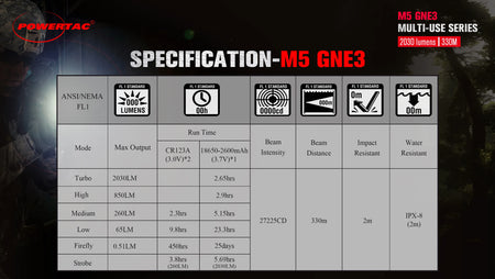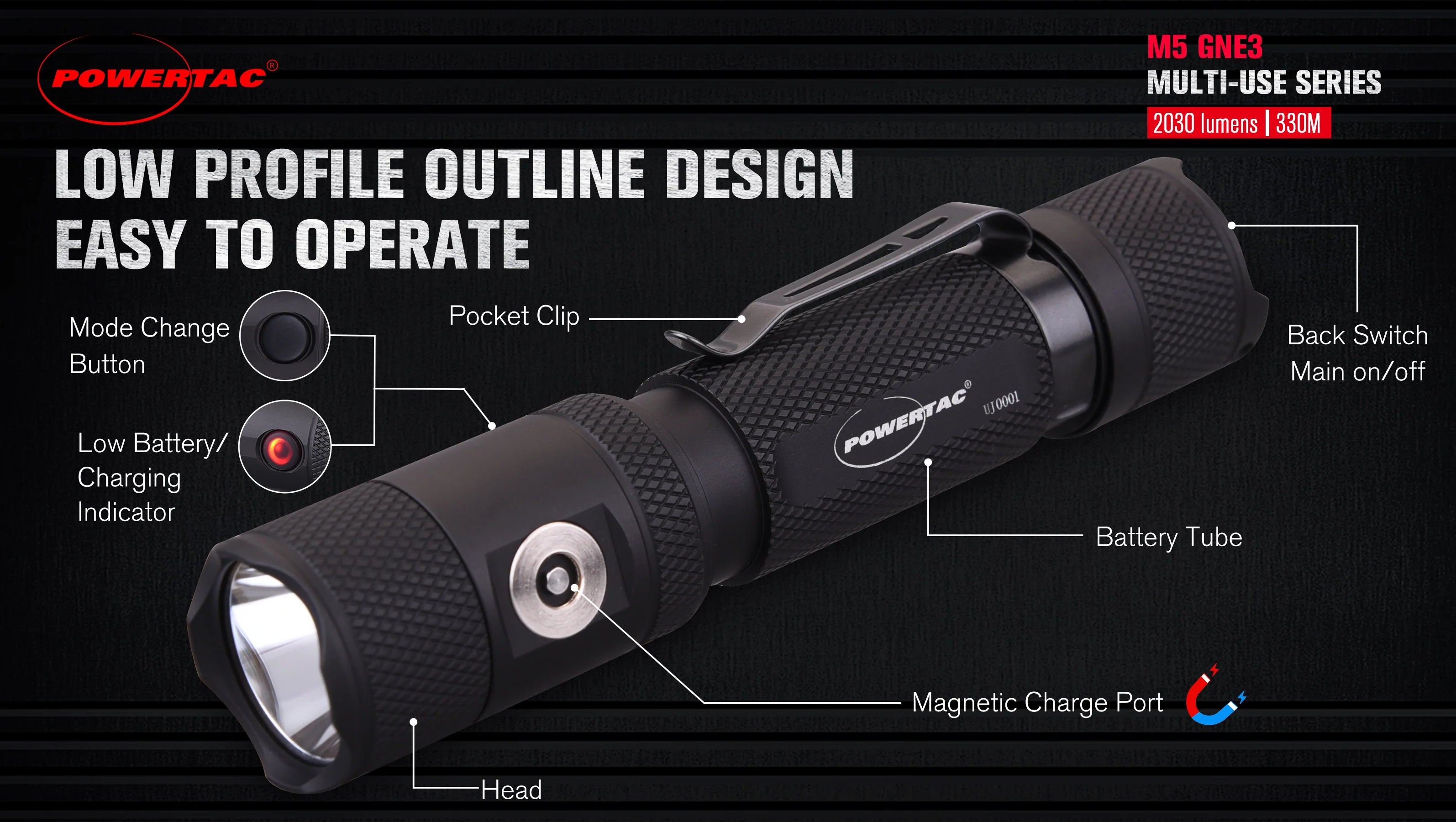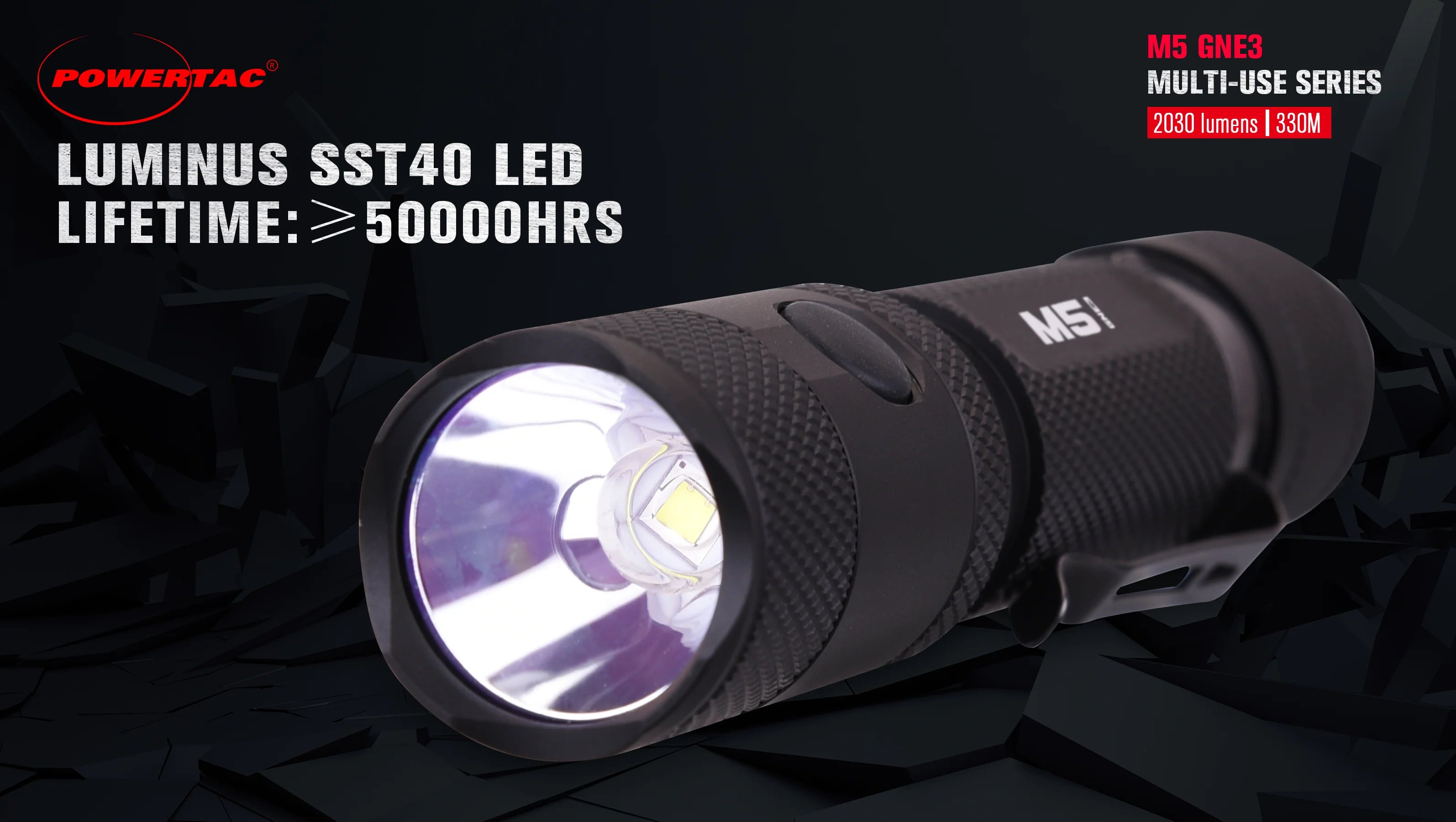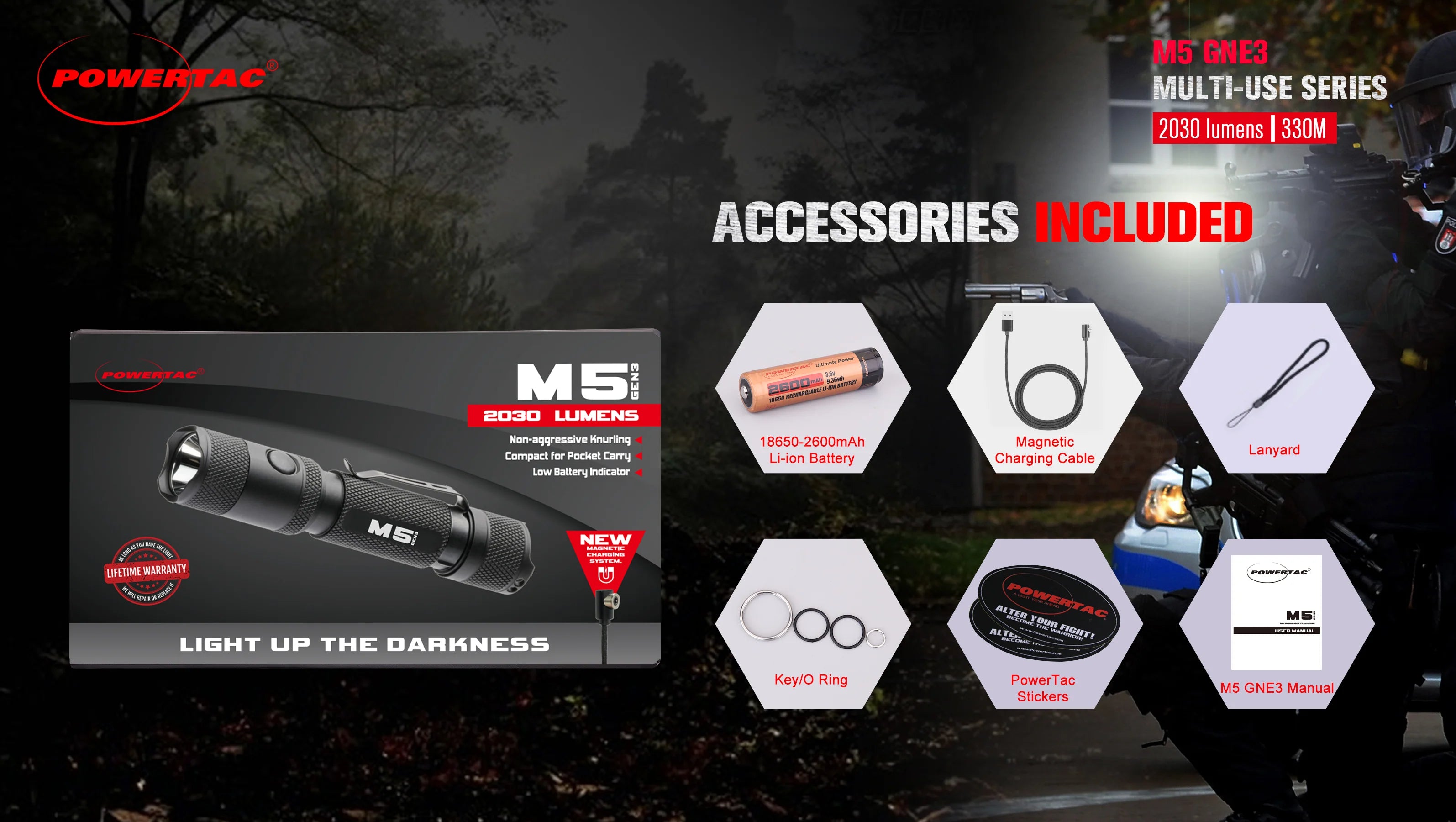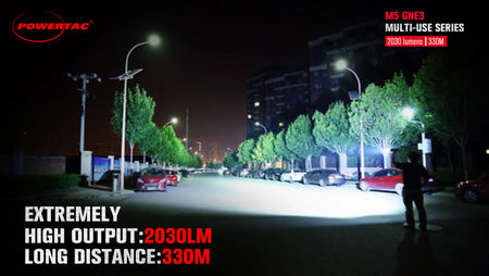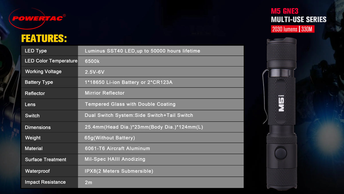 ●【High Lumens Tactical Flashlight】-The PowerTac M5-G3 tactical flashlight adopts the latest SST40 6500K LED bulb, which delivers up to 2030 lumens high output, 330M longest beam. Providing you with the brightness and meet you need for clearer vision. Ideal for Personal, Police and Military Applications.