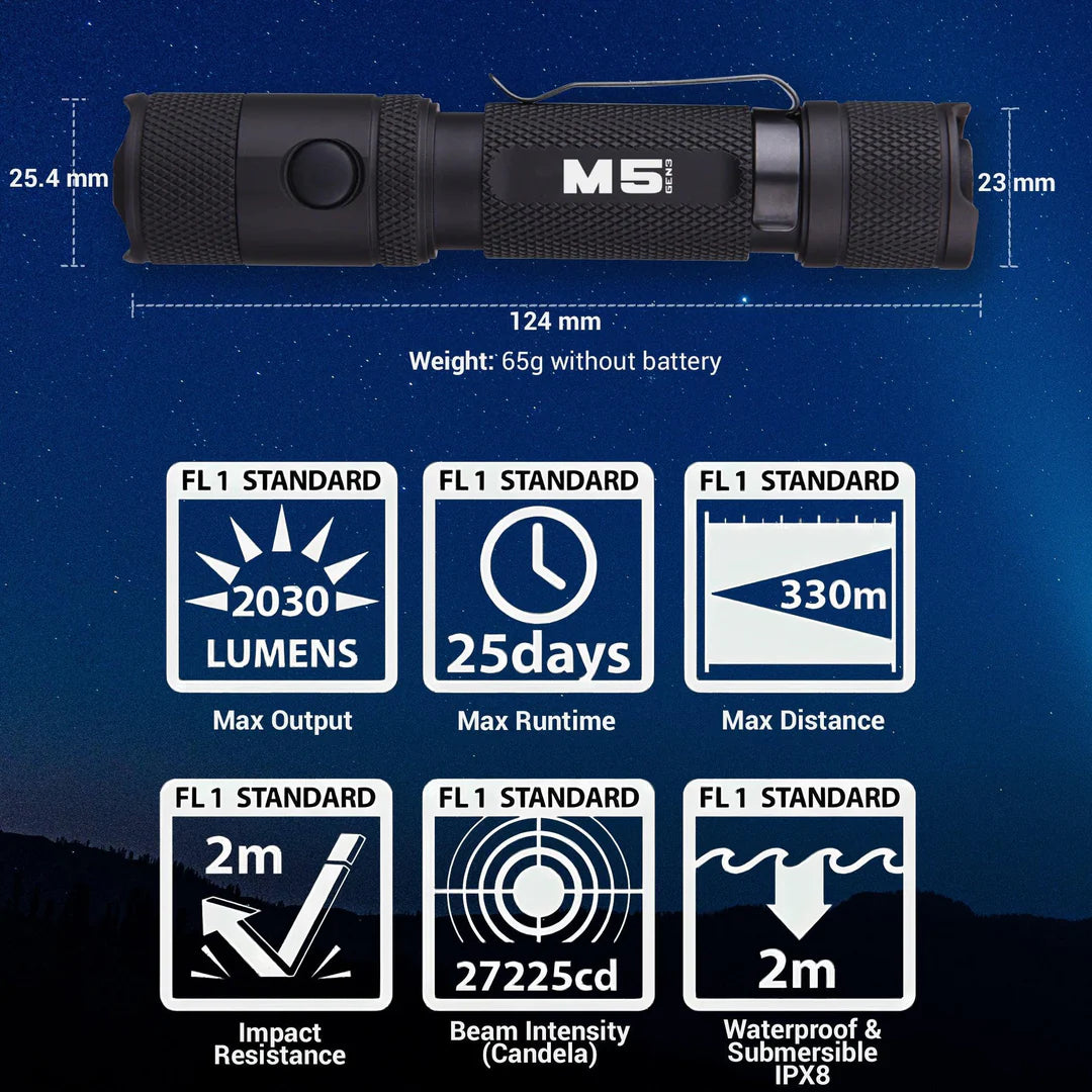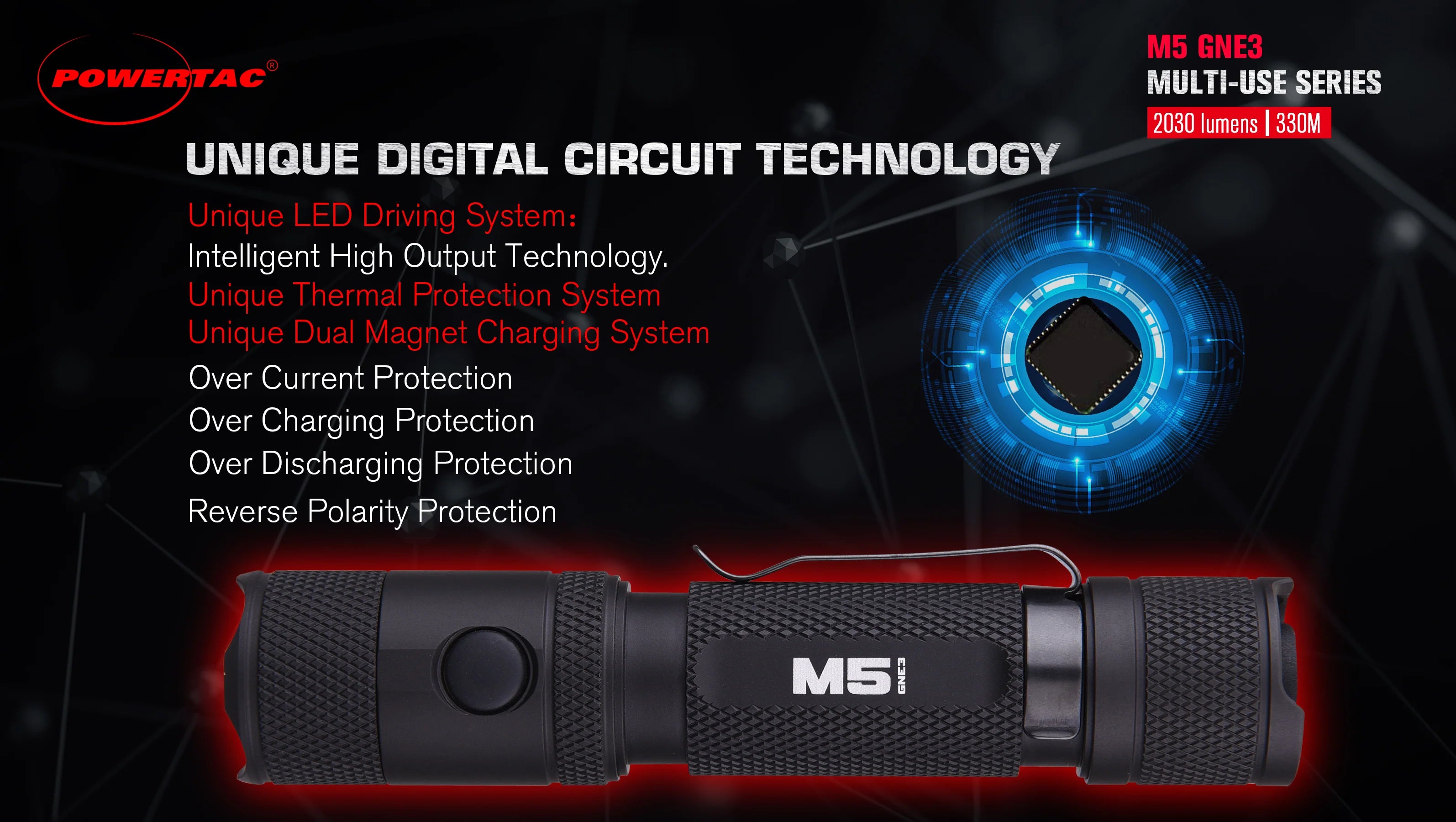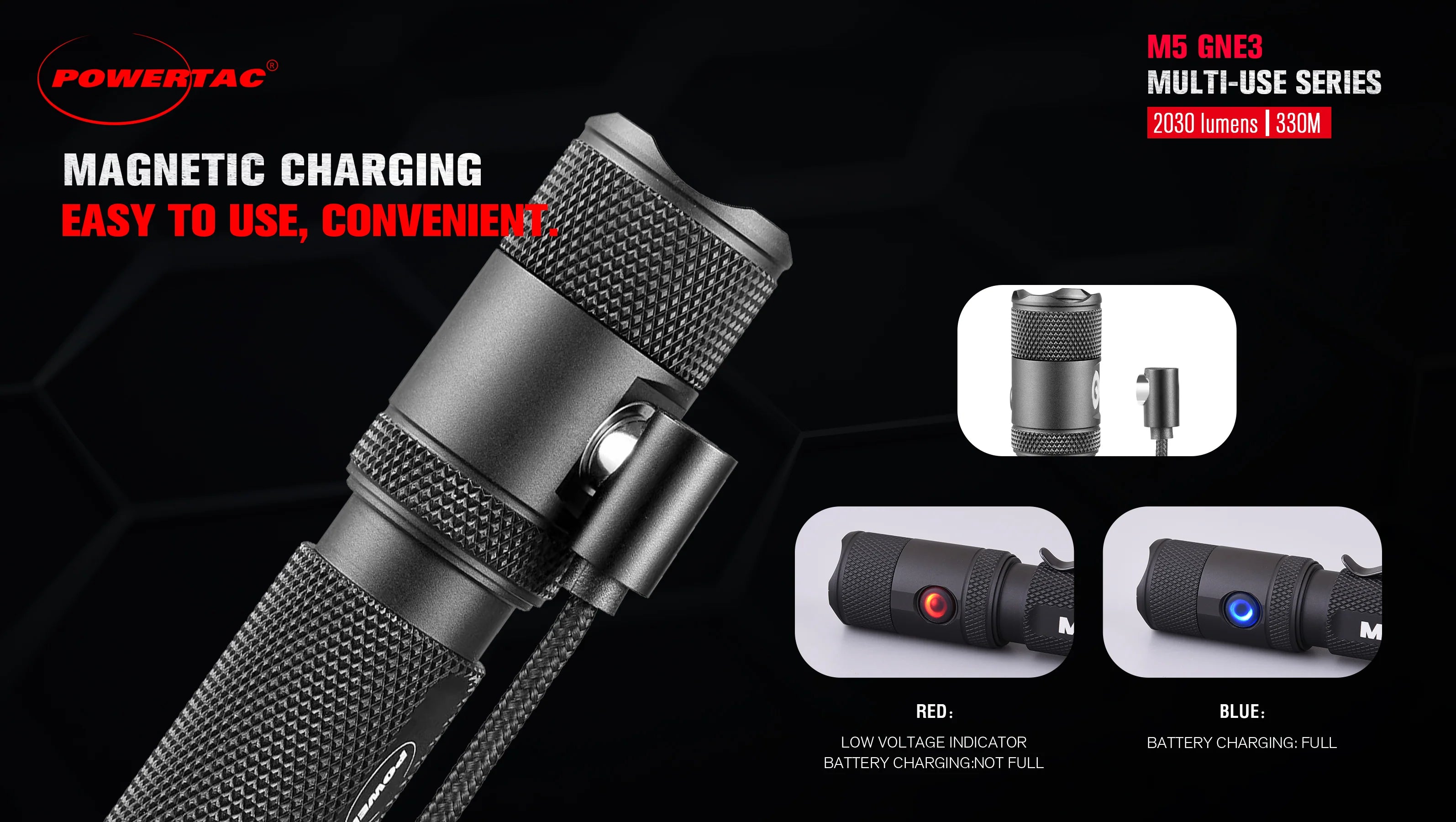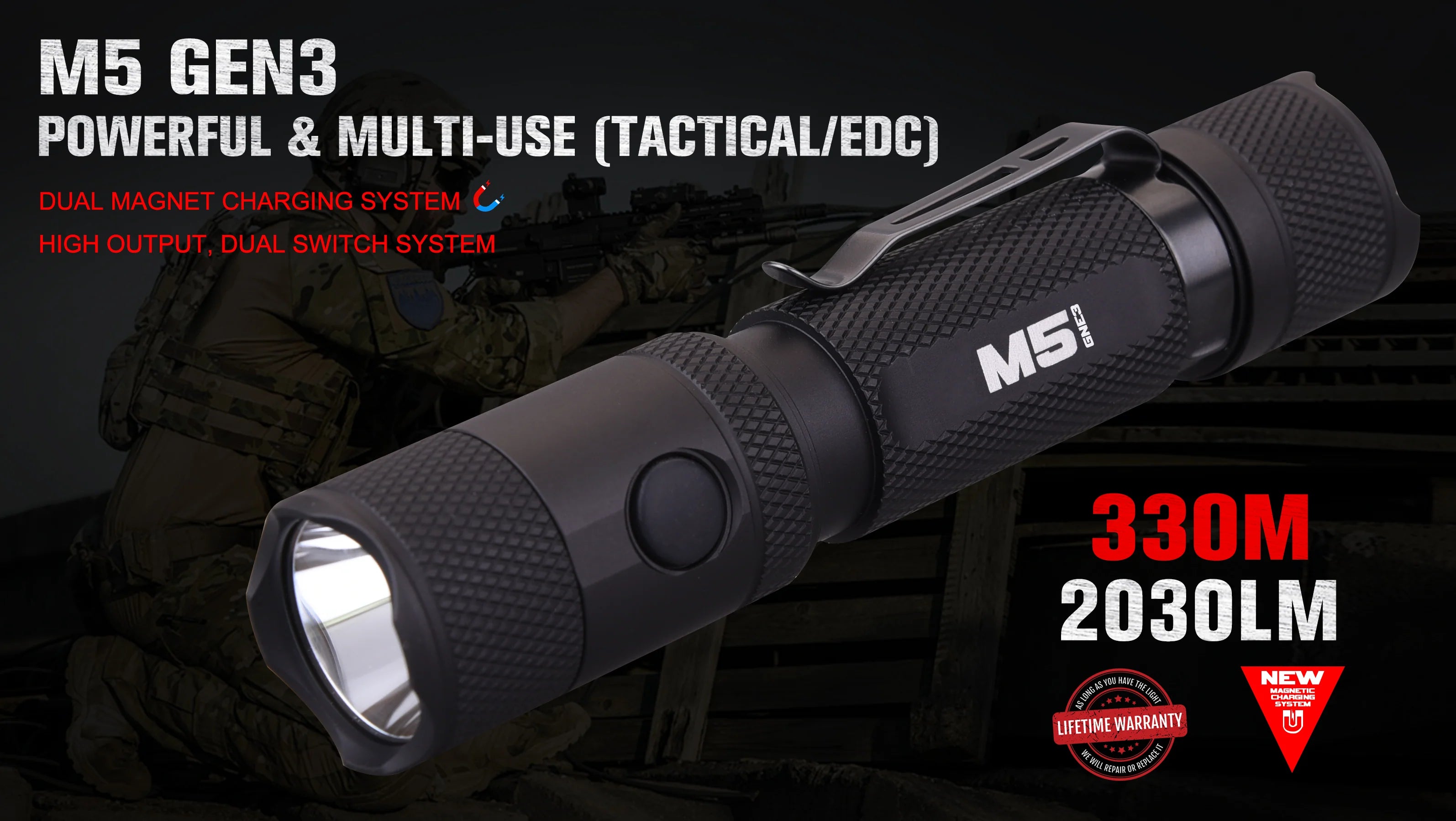 ●【High Lumens Tactical Flashlight】-The PowerTac M5-G3 tactical flashlight adopts the latest SST40 6500K LED bulb, which delivers up to 2030 lumens high output, 330M longest beam. Providing you with the brightness and meet you need for clearer vision. Ideal for Personal, Police and Military Applications.