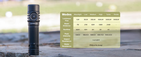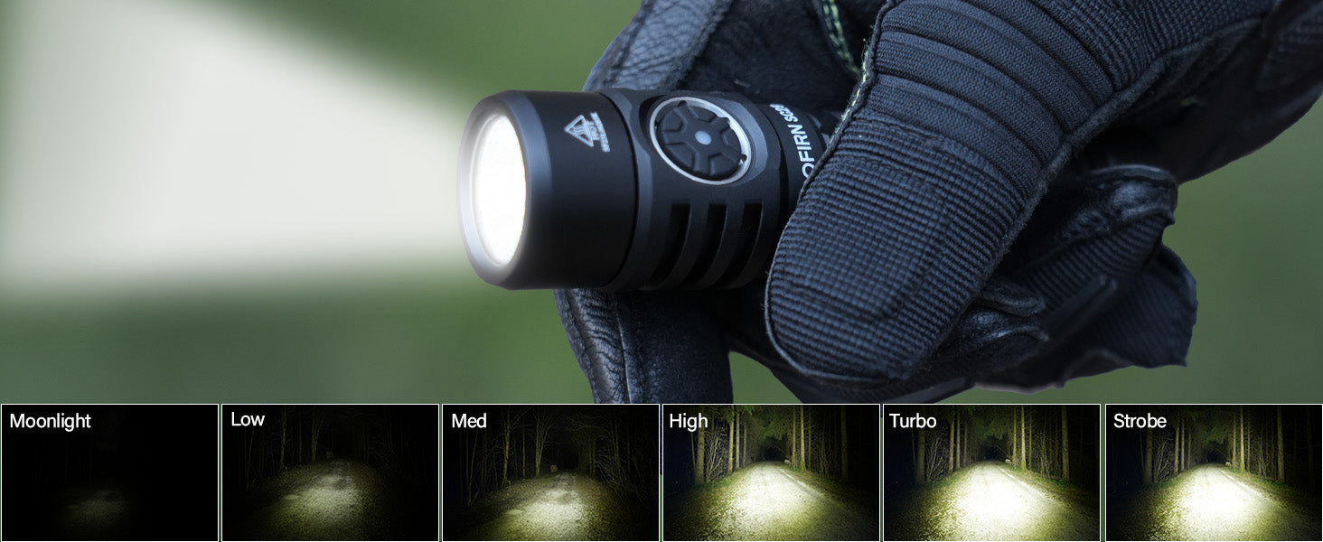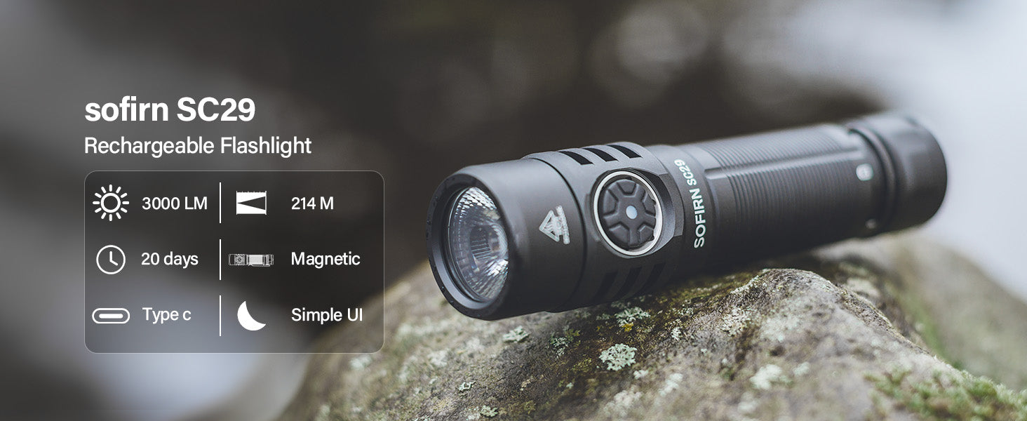 The Sofirn SC29 is a High Performance LED EDC Flashlight with 5 brightness levels available (2 lighting modes in total---gear mode and flashing mode), this small flashlight can meet most lighting needs in our daily lives. It reaches 3000 lumens at its maximum and delivers beam shots up to 142 meters away. A reliable companion for camping, hiking, adventuring, power outages, and emergencies.