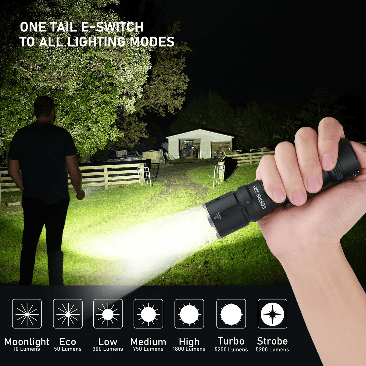 - 3 special modes: Strobe, SOS, Beacon