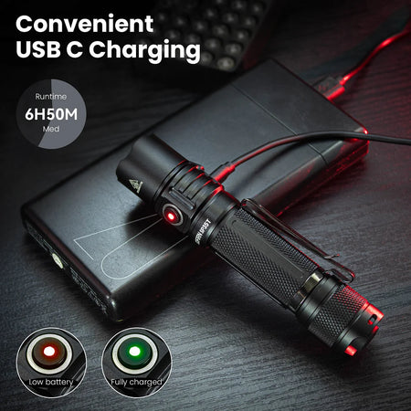 1. USB-C RECHARGEABLE: This flashlight has built-in USB C charging port. With a rechargeable 21700 battery, it can maintain without heating 500 lumens for nearly 7 hours at the medium level of powerful and non-diminishing brightness. It takes approximately 3 hours to charge one 5000mAh 21700 battery.