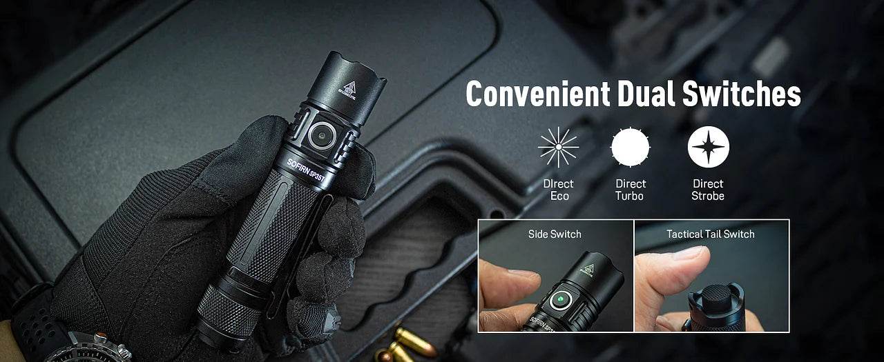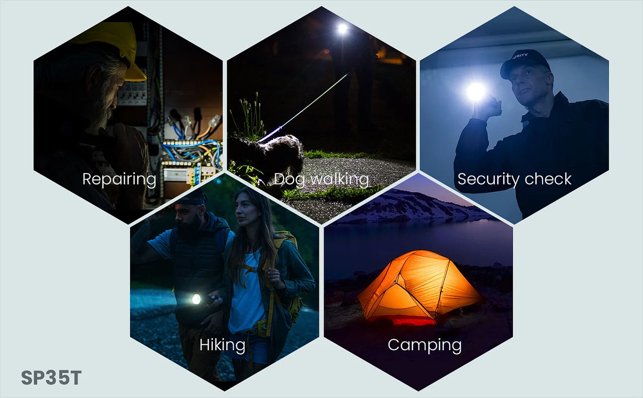2. Tactical Tail Switch: SP35T features dual-switch user interface offering easy and quick operation. The straightforward tail switch integrated into this design for emergency operation. It is a worthy companion in your bag for tactical or outdoors use.