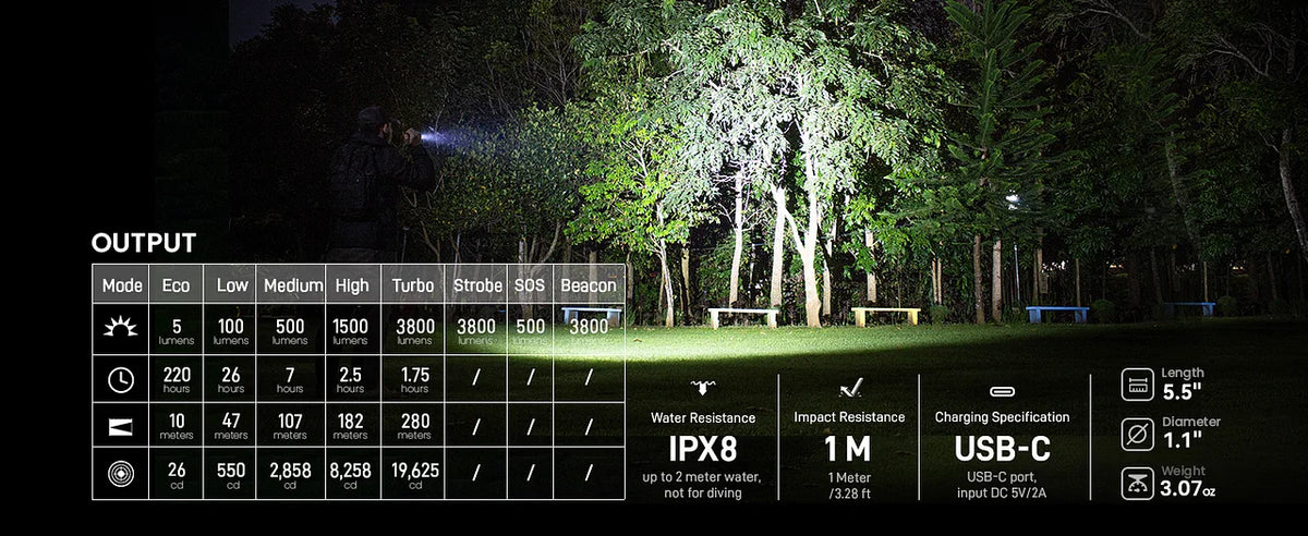 - Mode Memory: While on lighting mode, the flashlight memorizes the last brightness level used in the general lighting modes (Eco/Low/Medium/High)