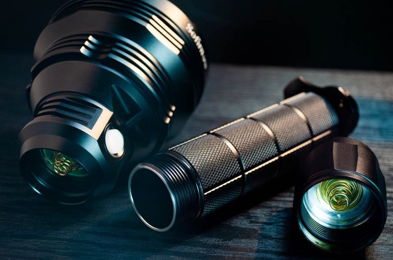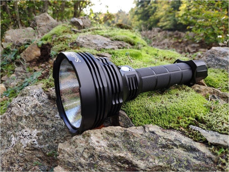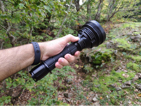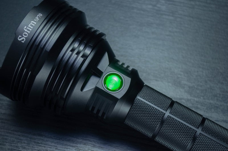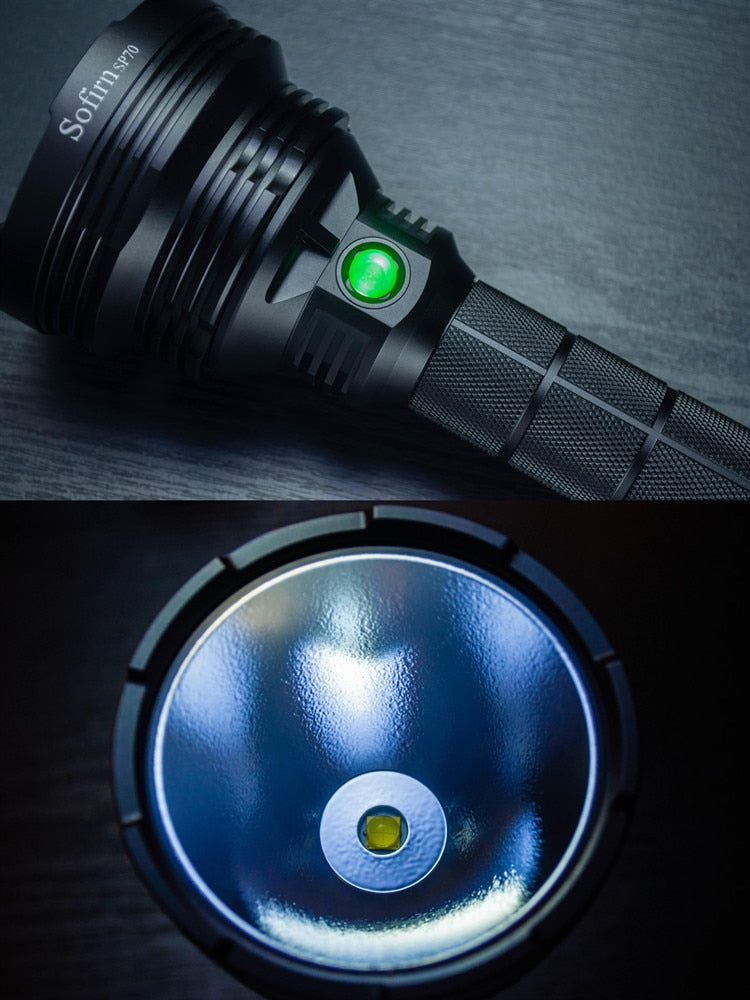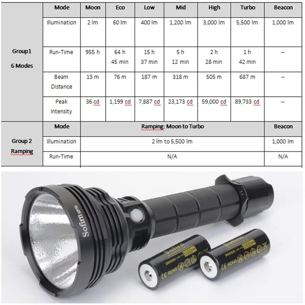 The Sofirn SP70 is a powerful outdoor flashlight kit. It can be used with two rechargeable 26650 or 18650 Li-ion batteries (with sleeves). Tail switch on / off, side switch controls two mode groups: Group 1 with 6 brightness levels and Group 2 with ramping capability.