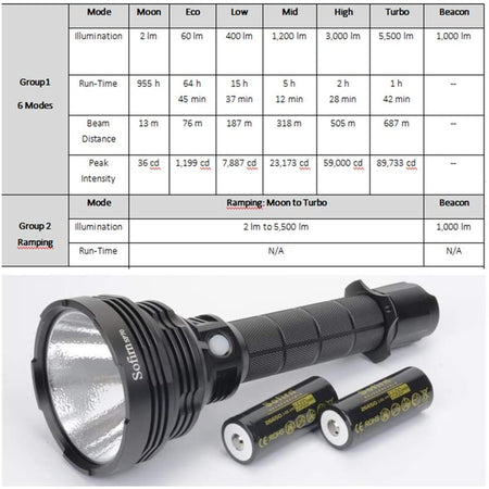 - Two Light Groups - Group 1 is 7 Models Eco(60LM)-Low(400LM)-Mid(1200LM)-High(4000LM) and hidden Moon (2LM), Turbo(5500LM), and Beacon(1000LM), and the group 2 is ramping up and down ensure you get the exact level of brightness you need for any use.