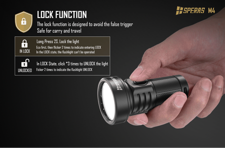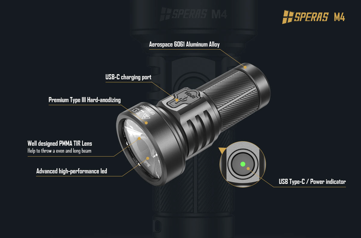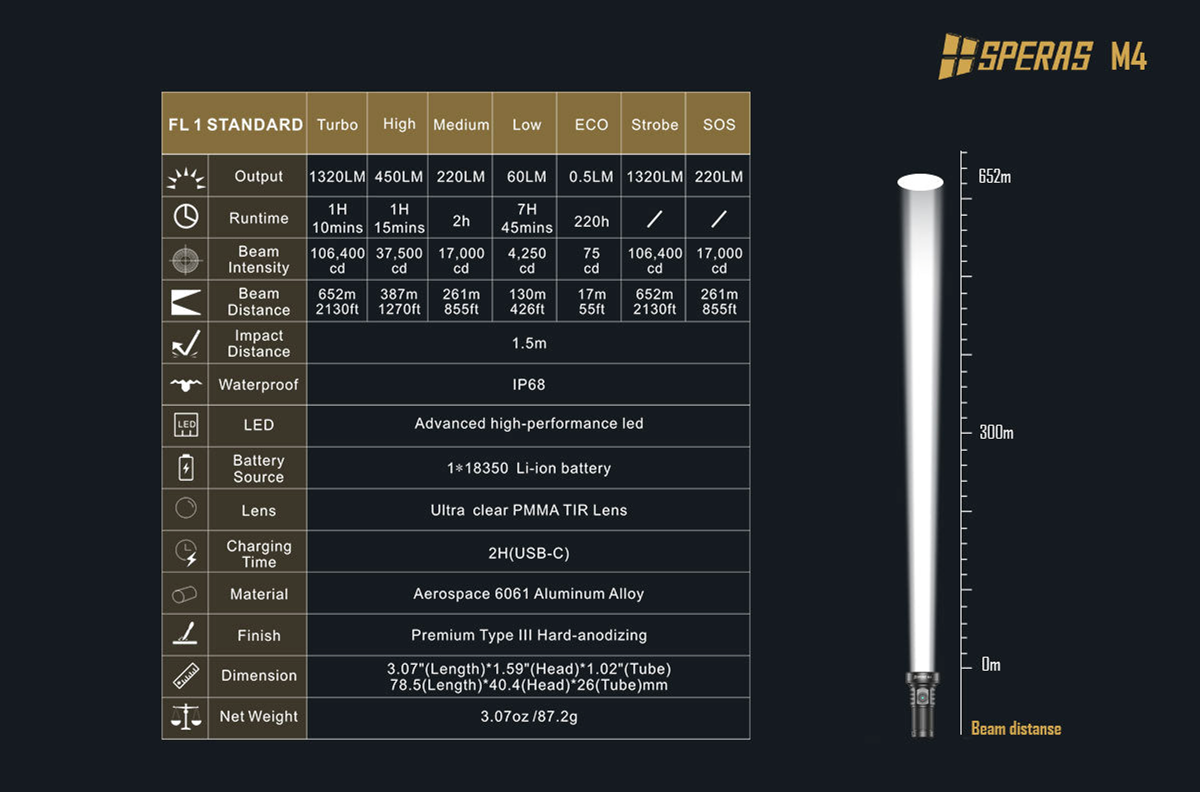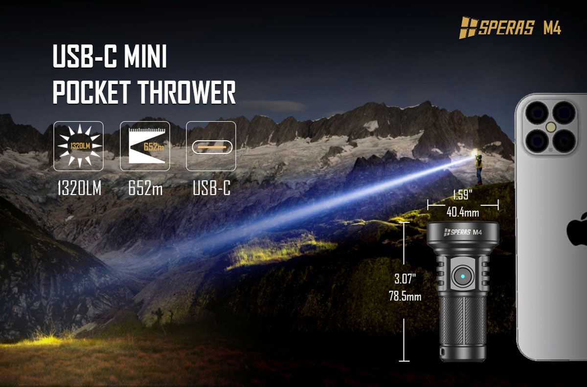 The Speras M4 is a new release EDC flashlight, which utilizes advanced high-performance LED, emits bright light up to 1320 lumens, and reaches 652m (2130ft). It packs 7 different light modes, Turbo, High, Medium, Low, Strobe and SOS mode, with impressive runtimes (Up to 220 hrs. in Eco mode). With its user-friendly interface and memory function this is an ideal flashlight for daily use, camping etc.