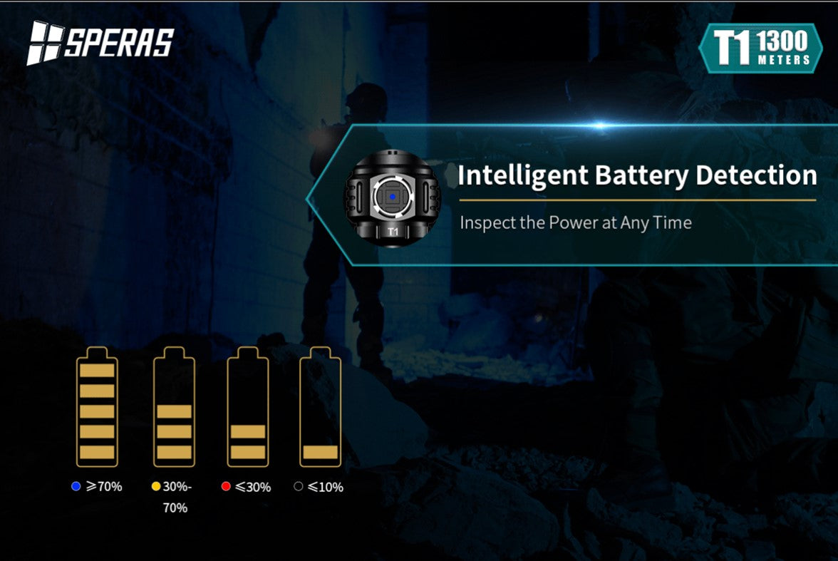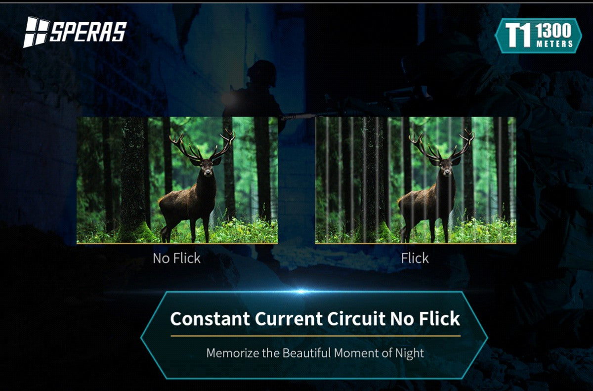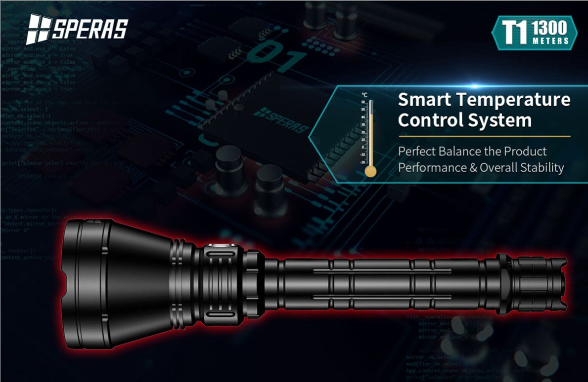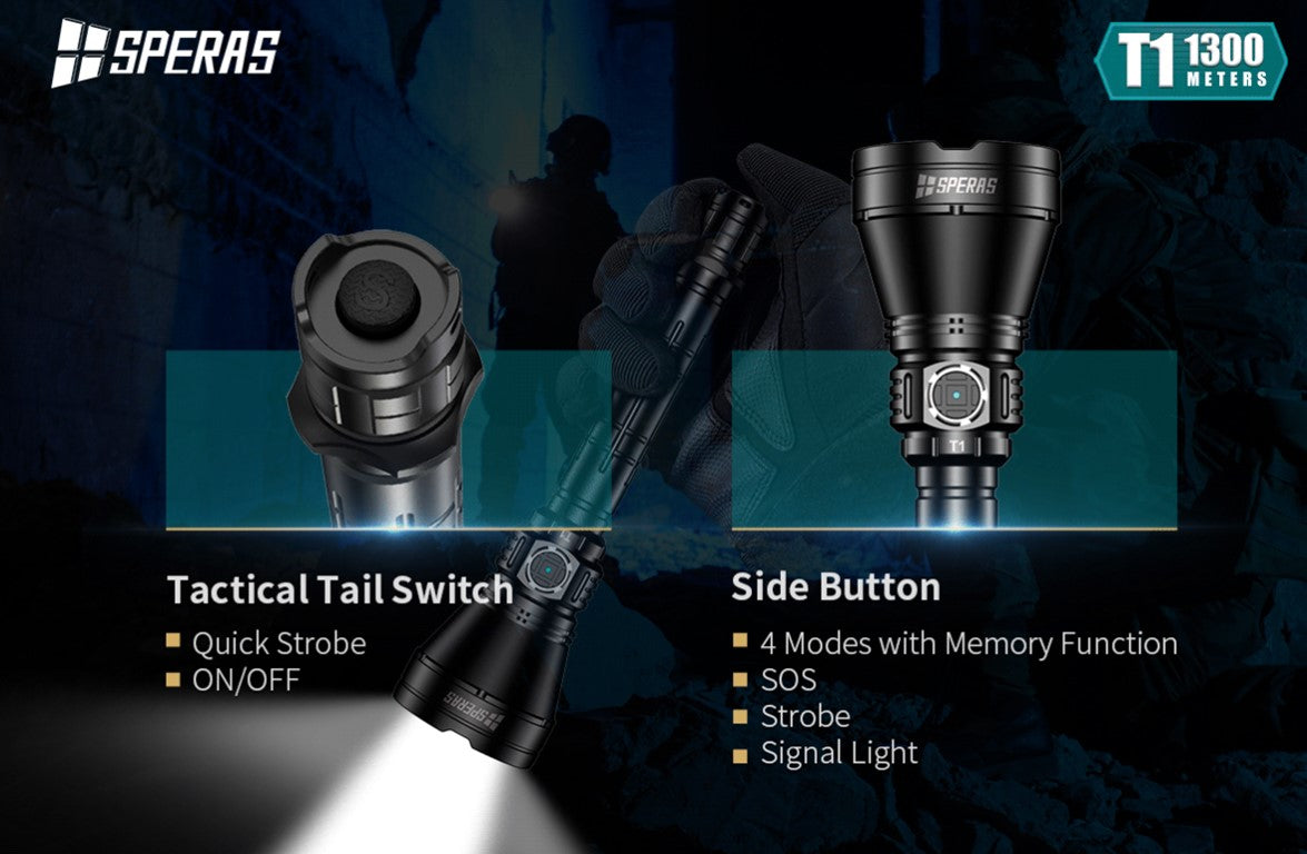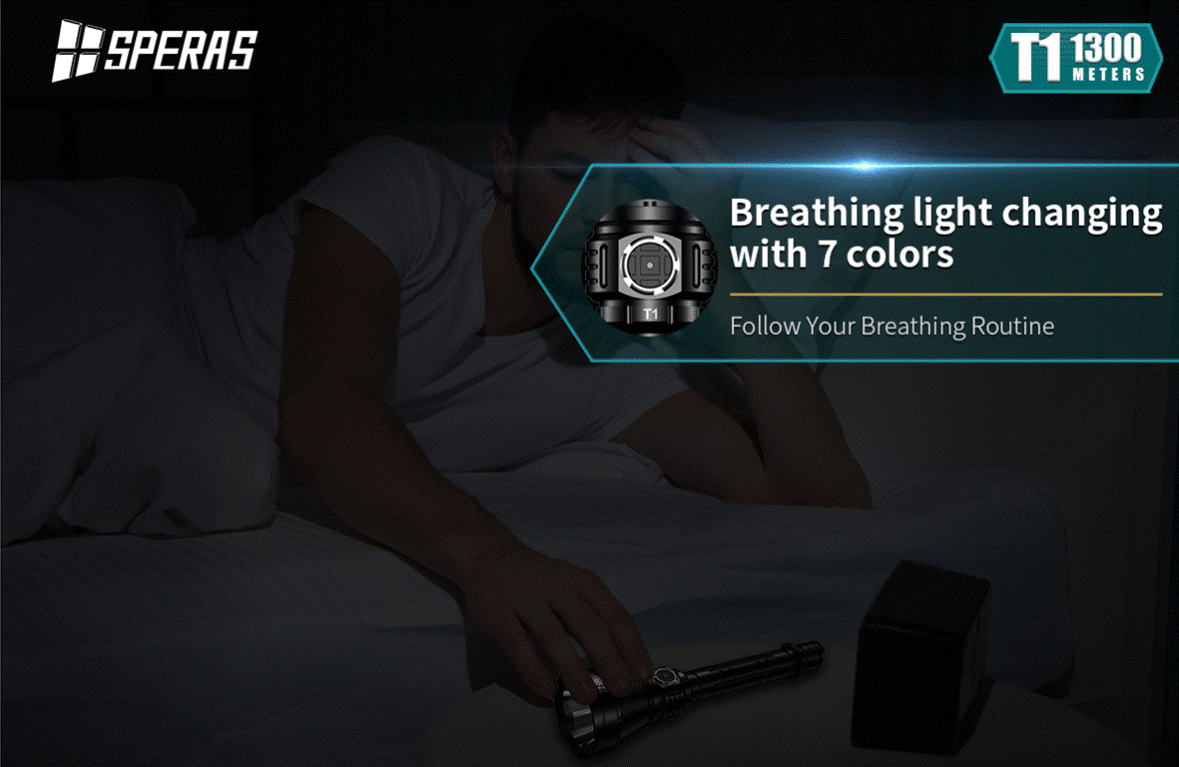 The SPERAS T1 has a super beam distance of 1300m and high performance of 1200 lumens, customized OSRAM LED, a synchronous step-down circuit with high efficiency up to 92% and special optical system. It is an excellent long-rang flashlight. The tail button has mode memory function and can realize ON, momentary-ON and quick strobe function. LED breathing function with changing 7 colors gives you a different experience. T1 is suitable for police and military, law enforcement, search and rescue, hunting and other outdoor activities.