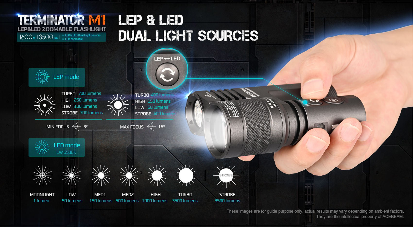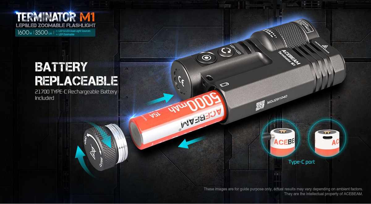 The Terminator M1 is Acebeam's first product that combines the latest LEP with LED technologies. It's LEP module produces a zoomable spotlight beam up to 1600 meters (1750 yards), with a distance of more than one mile! Easily switch between Spotlight or Floodlight with a shortcut key. Powered by a high capacity 5000mAh rechargeable USB-C 21700 Li-ion battery. The perfect replacement for the ultimate floodlight, spotlight, signal light or any light.