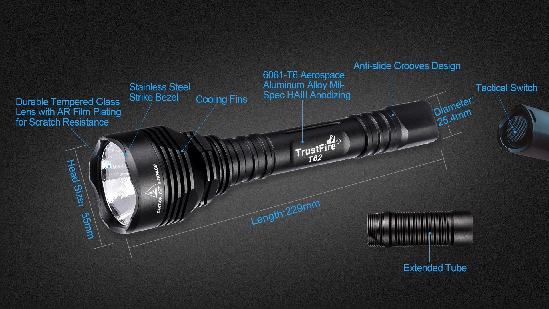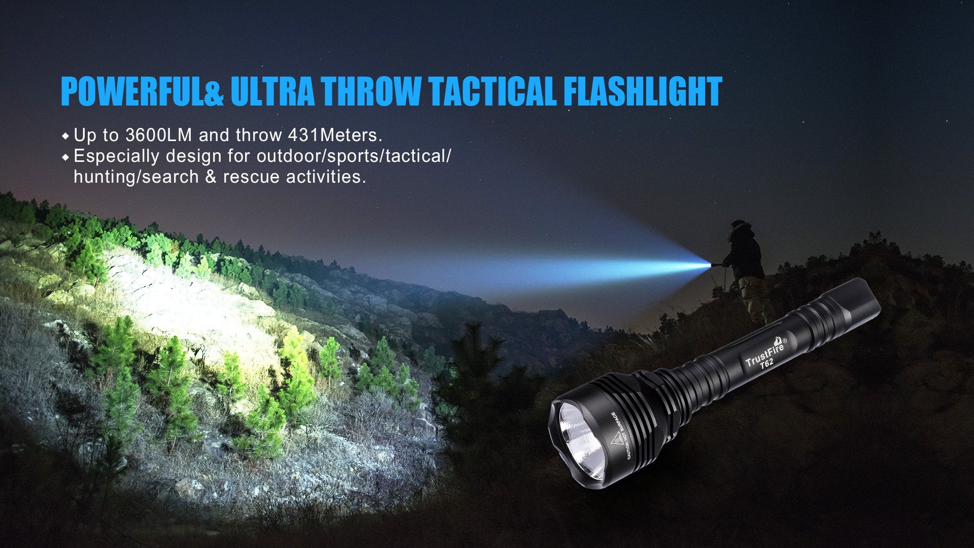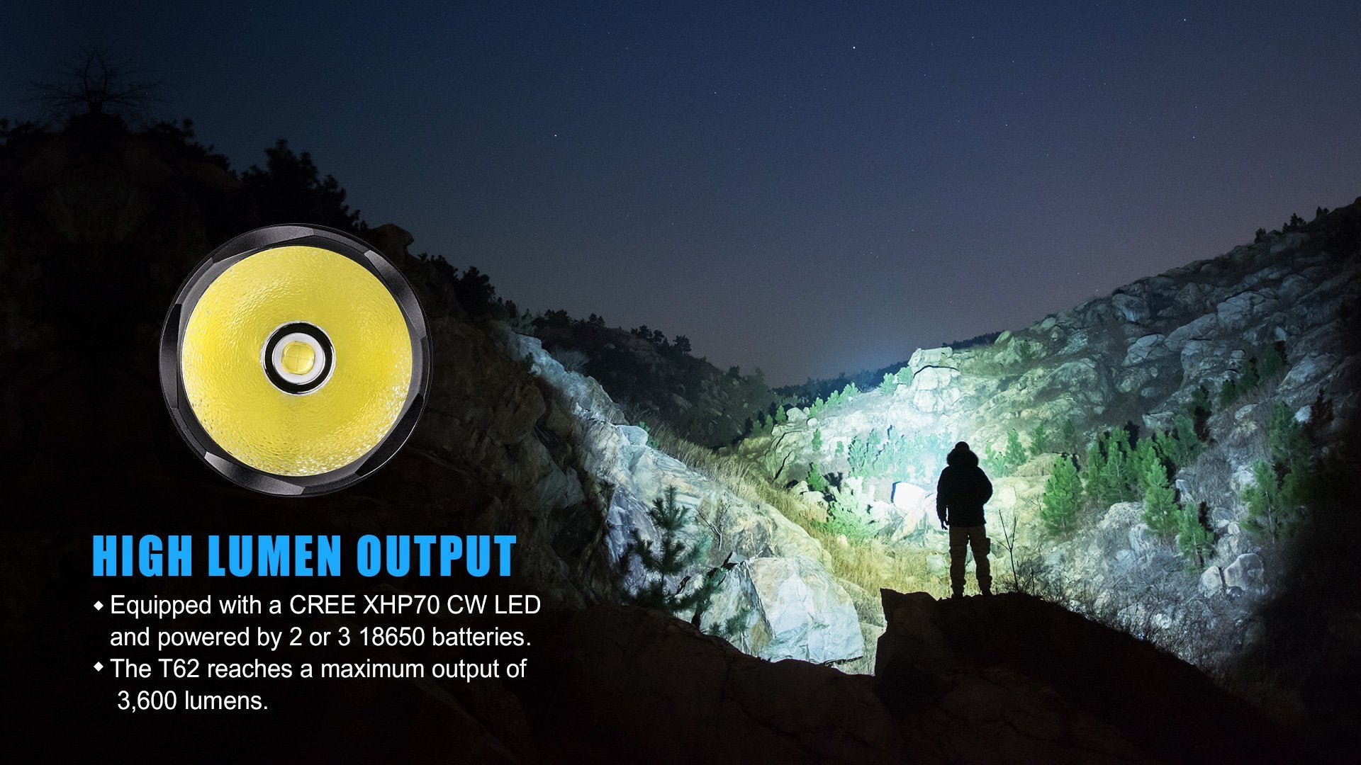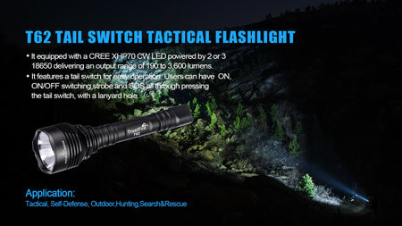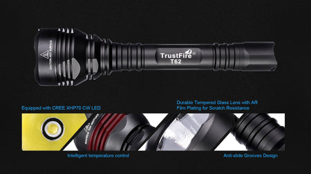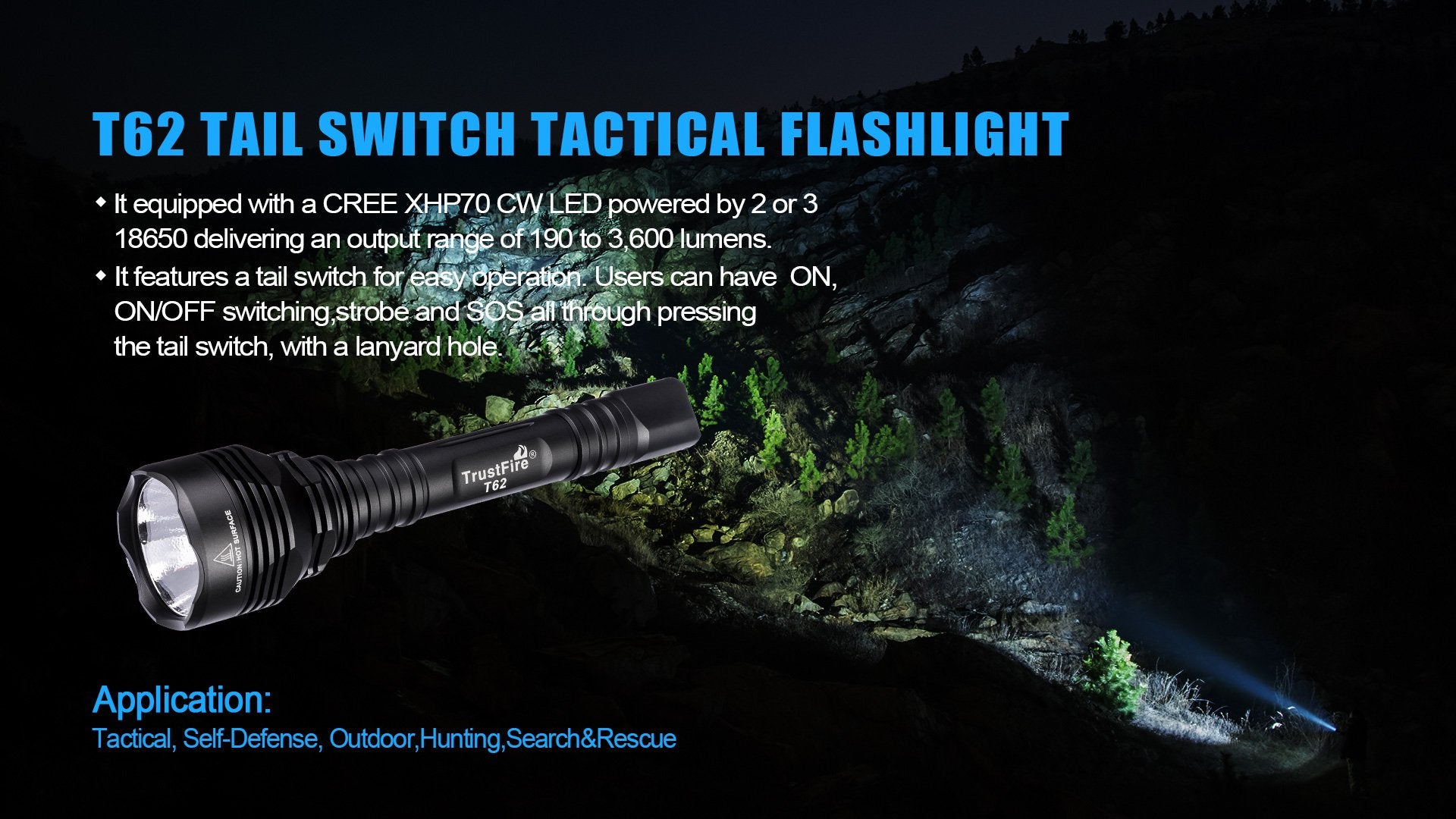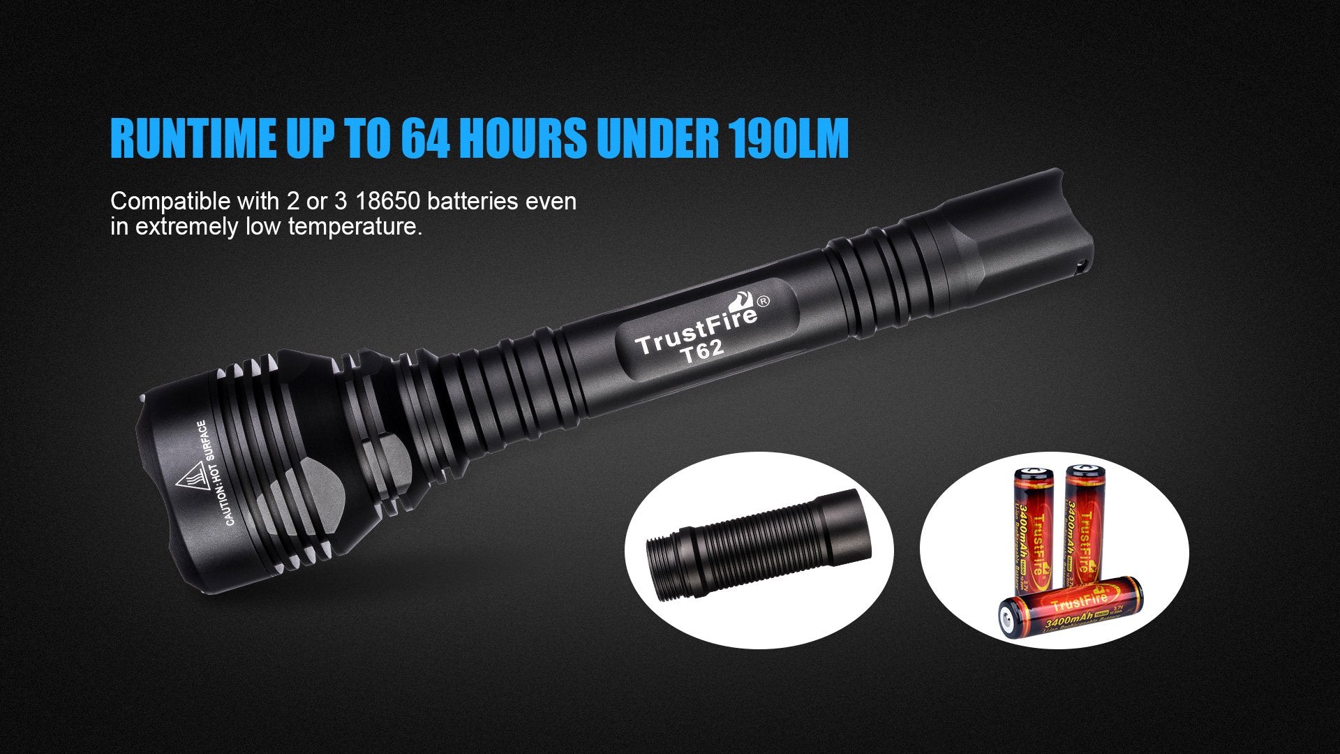 TrustFire T62 LED Flashlight utilizes a CREE XHP70 and delivers a MAX 3600 Lumens which produces an intense bright white beam of up to 431 meters. Powered by 2x18650 or 3x18650 3.7V rechargeable batteries.
