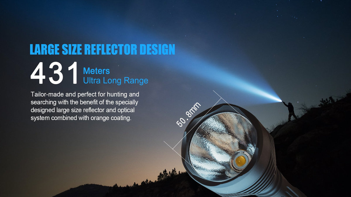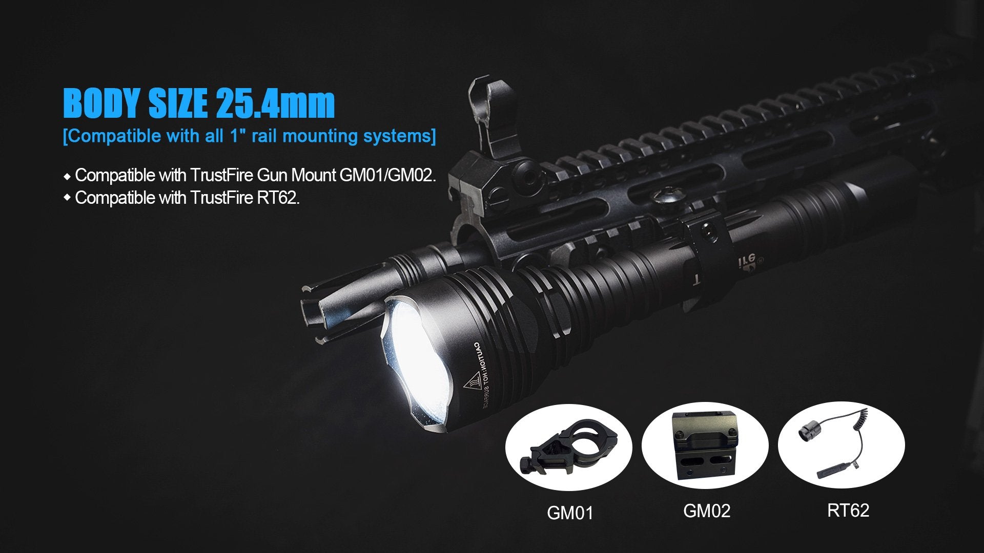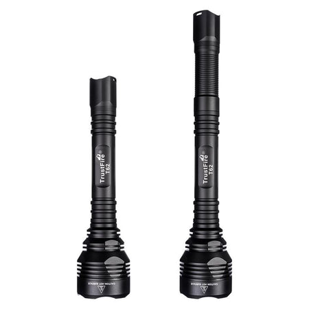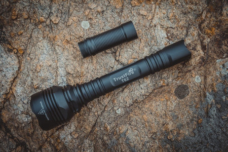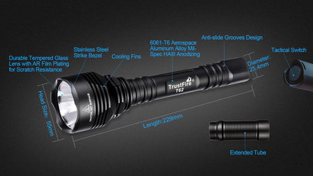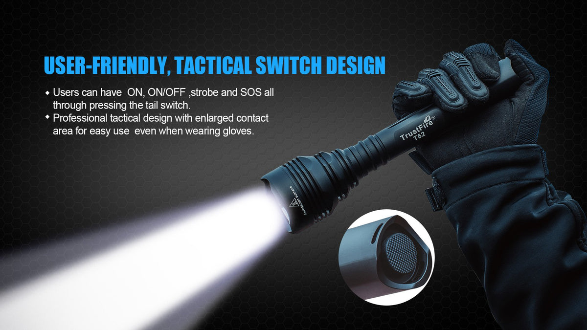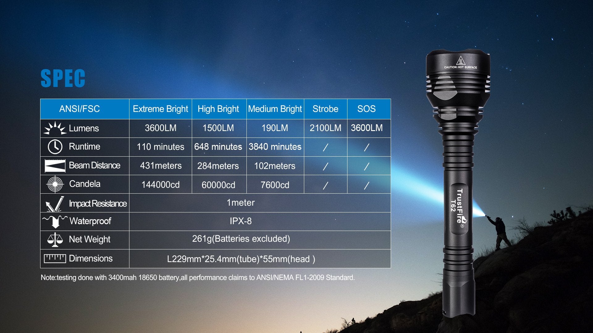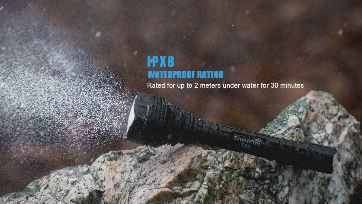 TrustFire T62 LED Flashlight utilizes a CREE XHP70 and delivers a MAX 3600 Lumens which produces an intense bright white beam of up to 431 meters. Powered by 2x18650 or 3x18650 3.7V rechargeable batteries.