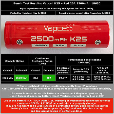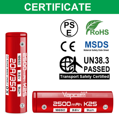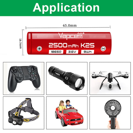 Please note that while the Vapcell K25 is suitable for high-drain applications, it is not a protected battery. Ensure proper handling and usage within recommended parameters to maintain safety and longevity.