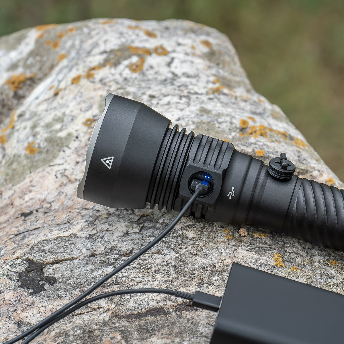 The Weltool F6R is a high-lumen and long-range rechargeable flashlight with a turbo output of 5,200 lumens and a throwing distance of 1,202 meters. It comes with a 3.6V 15,000mAh LMFP battery,and its cycle life is twice that of ordinary lithium-ion batteries. The F6R head has a Chinese patented charging structure, which is waterproof and dustproof; the USB-C charging port has a charging indicator light; there is also a stainless steel UNC 1/4" threaded hole on the Light head, which can be installed on a tripod; there is a stainless steel parachute ring at the end of the flashlight body, which can be equipped with a shoulder strap for easy carrying.