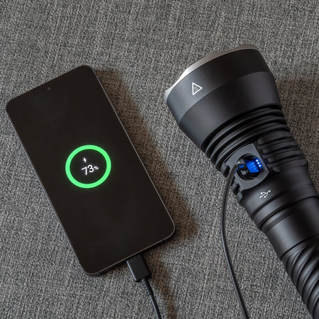 The charging power of F6R can reach 18W, and the USB-C port can output/input. It integrates QC2.0/QC3.0/SCP output protocol, FCP/AFC input and output protocol, TYPE-C/PD2.0/PD3.0 input and output protocol, PPS output protocol, BC1.2/Apple/Samsung's DCP protocol, and can be used as a power bank to charge mobile phones and other digital products. F6R has 5 modes and strobe; the side-pressed electronic switch has a power indicator light, and the switch can be locked in the off state to prevent accidental touch; F6R has 361,500 candela, which is particularly suitable for search, rescue, outdoor adventure, field operations and other purposes.