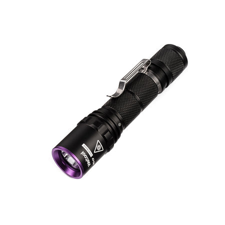 M2 UV flashlight is also called a black light, which adopts a high efficiency pure 365nm UV-A LED with the LED radiation flux of 2100mW. The flashlight body is compact with a steel clip included as an accessory, powered by 1 piece of Li-ion battery, compact and portable.