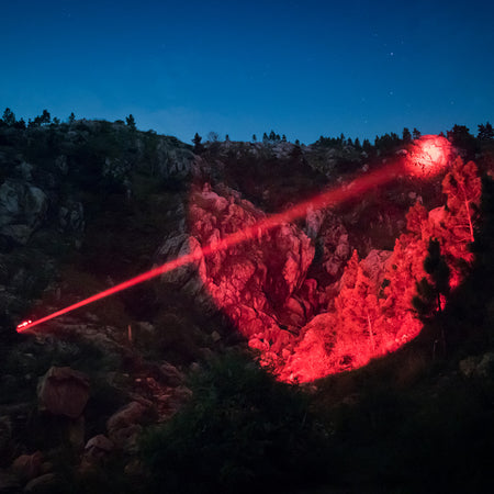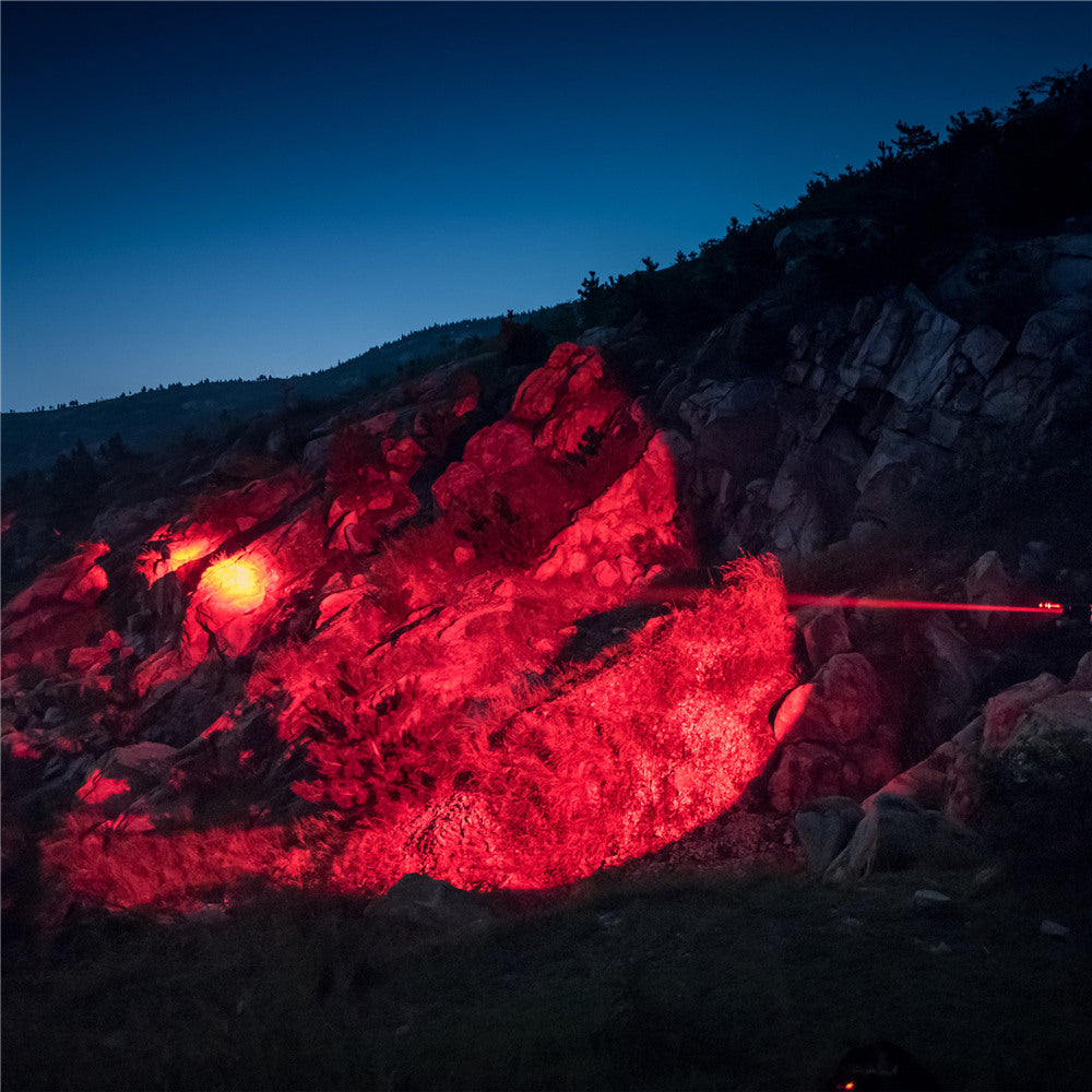The T10-HR is a super long-throwing red LED hunting light specially designed for outdoor hunting. It is available in 2 types: T10-HG (green light) and T10-HR (red light) for different preys. The T10 adopts Projection Compact green LED (about 550nm) or red LED (about 620nm), which can dispense with color filter. LED of high luminous intensity with super-concentrating reflectors creates extraordinary long-range beam! T10-HR's light intensity up to 50600cd candela! The luminous flux is up to 342 lumens and the beam distance is 450 meters! The standard 1-inch diameter body is suitable for most mounts and can be easily mounted on shotguns with optional tail remote switches. T10 has high and low modes with beacon mode which is convenient for positioning in the field. IP67 rating, it can be used in heavy rain. The unibody construction of the T10 gives it a high rate of heat dissipation and shock resistance, and the drive circuit is with high-efficiency temperature control protection function, complementing the built-in multiple tiers of protection system, including low-voltage warning, reverse polarity protection.