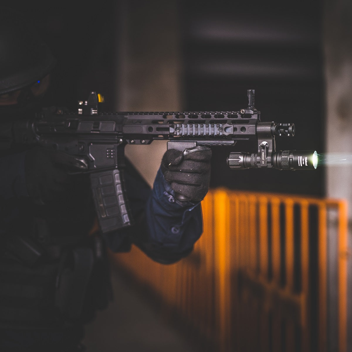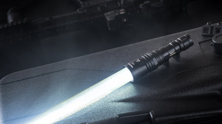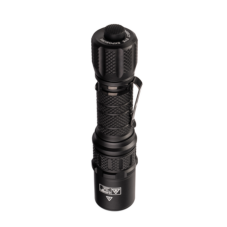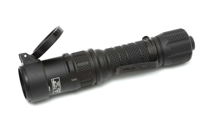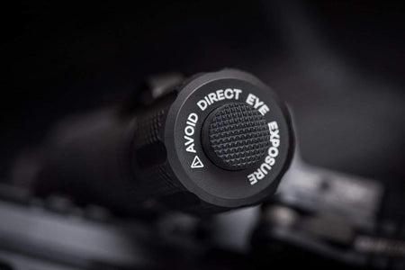 The tail cap acts as a “safety key” and must be kept safe. The tail cap switch can shut off the light immediately or by twisting off the tail cap as a safety back-up. An opaque lens protector is included as a standard accessory. Equipped properly, this protector will prevent any light from escaping the front of the flashlight as a safety device.